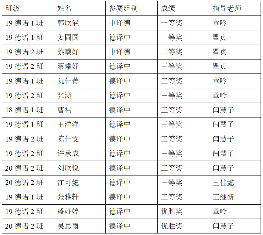 德语系在章吟、瞿贞、闫慧子、王佳懿、王继新等德语系老师的指导下,共有14位同学分别在中译德、德译中两个组别中获得一、二、三等奖,优胜奖的优异成绩。具体获奖同学名单如下:
