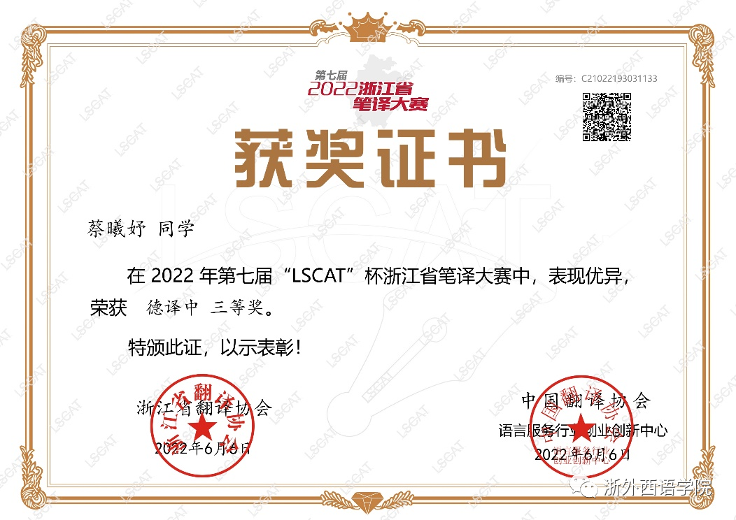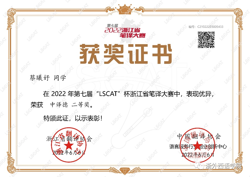 在2022年第七届“LSCAT”浙江省笔译大赛中,色漫网
