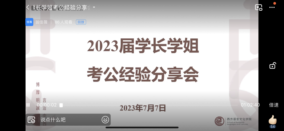 7月7日晚,2023届学长学姐考公经验分享会在线上举行,三位成功考取公务员的优秀学子分别就关注自我定位、如何备考、面试经验、能力养成等方面进行分享。学院辅导员和近九十名在校生参加分享会。团委书记翁佳薇主持分享会。