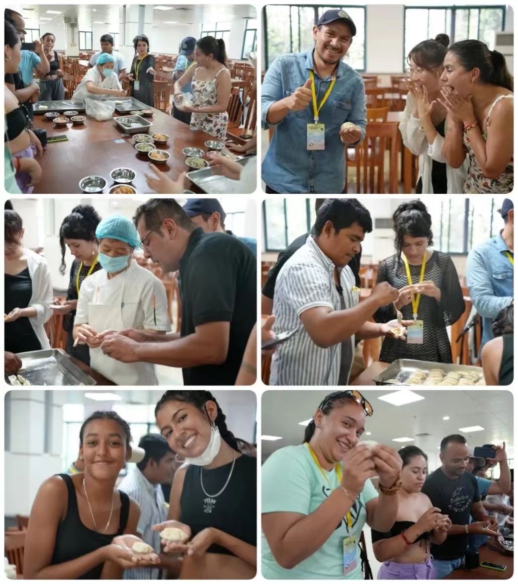 暑期学校还组织学员们沉浸式体验中国传统美食制作—“包饺子”。活动中,经验丰富的厨师向13名“洋学生”传授包饺子的方法和技巧,并讲述中国民间吃饺子的传统习俗,以及“元宝藏福”“祈福驱暑”的中国哲学。“因为饺子形状很像中国古代元宝,所以吃饺子也寓意招财进宝!”厨师边包边讲解。学员们一脸兴奋,格外认真地模仿制作,很快便掌握了要领……看着案台上摆满了“元宝、钱袋、帆船”等形态各异的饺子,学员们纷纷拍照并分享家人和朋友。Wendy说:“太有意思了!我要把饺子文化带回国内,让中国饺子出现在哥伦比亚家庭聚会的餐桌上!”