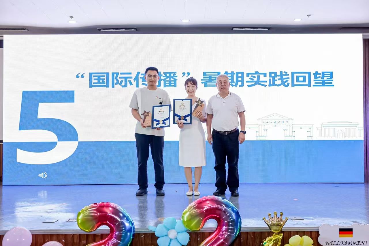 范捷平为2名“国际传播”暑期社会实践(西班牙团组与哥伦比亚团组)优秀指导教师颁发奖杯与证书。张禄彭、戴力为实践团成员颁发“中华文化传播之星”奖杯与证书。22西语中外1班雷洁与21西语1班唐益程作现场发言,表示:“暑期实践以传播《中国学》,深化文明互鉴为使命,不仅锻炼了外语专业水平,提升了团队组织协作能力,更加深了中外青年友谊,希望全体新生积极参与中外文化交流与教育交流活动”。