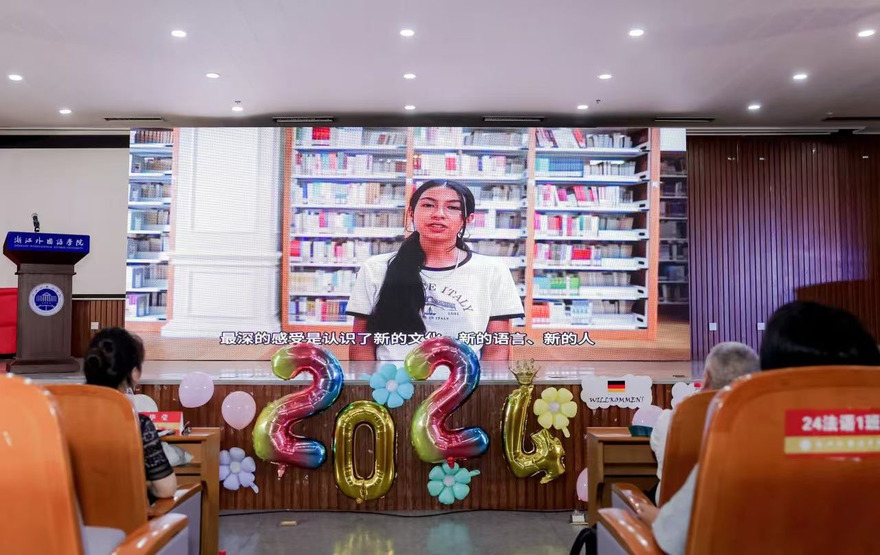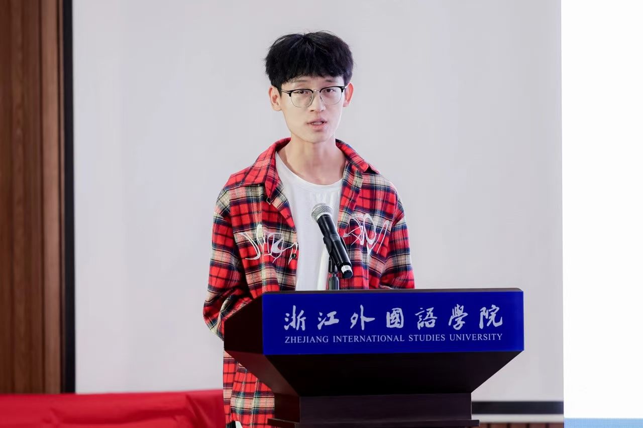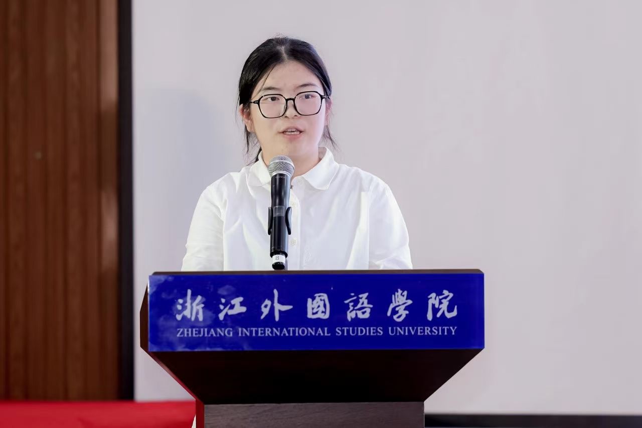 24俄语1班沈一诺作为新生代表发言。她分享了自己的大学四年目标以及对浙外的感受,号召全体新生要积极进取、不懈努力,立鸿鹄之志,做品学兼优之人。