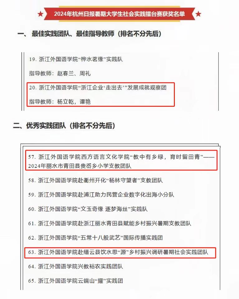 喜获佳绩,共有三支团队入选优秀实践团队名单。其中,“浙江企业‘走出去’”发展成就观察团荣获“最佳实践团队”称号,“教中有乡绿,育时留田青”——2024年丽水市青田县贵岙乡小学支教团队、赴缙云县饮水思“源”乡村振兴调研暑期社会实践团队荣获“优秀实践团队”称号。