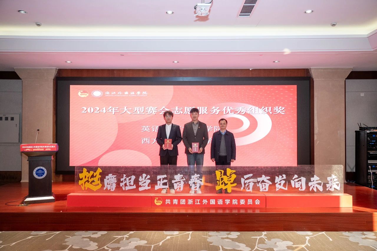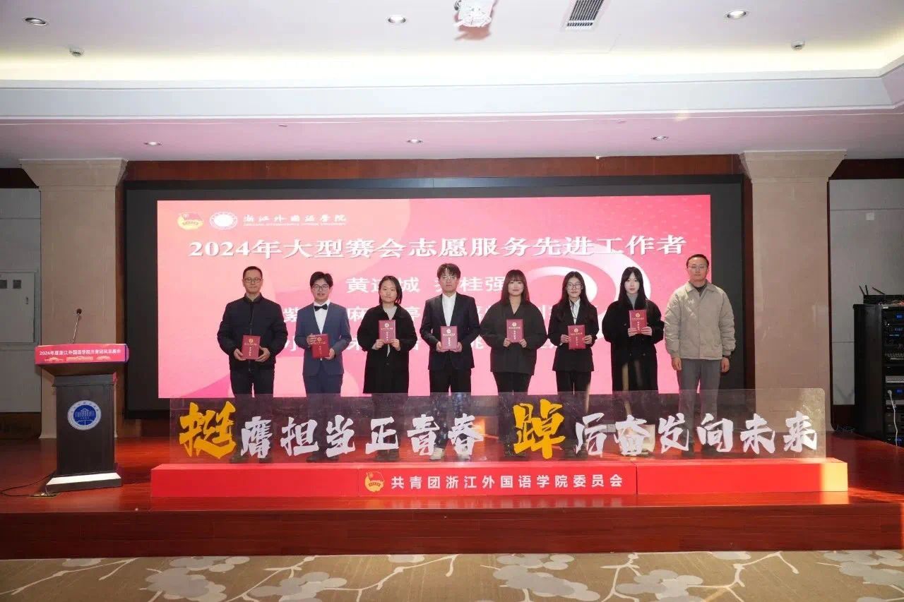 获评2024年度学校大型赛会志愿服务优秀组织奖,辅导员黄连城、23德语2班朱之诺获评先进工作者,22西语2班吕瑶洁获评优秀志愿者。