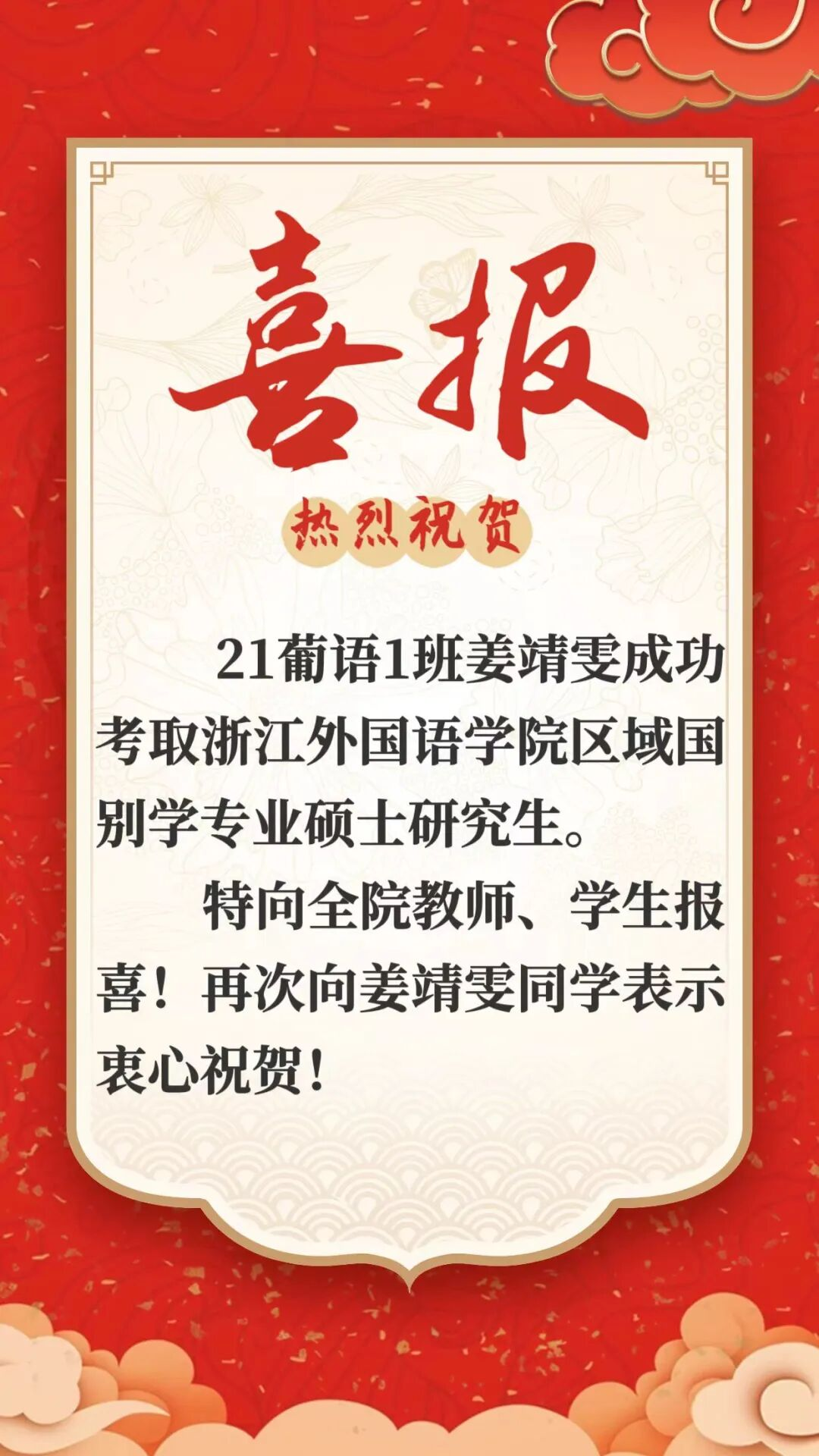 荣誉喜讯 | 21葡语1班姜靖雯成功考取色漫网 区域国别学专业硕士研究生(25年国内升学第13期)