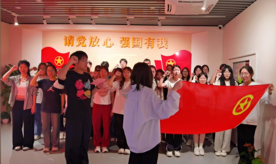 “我志愿加入中/国 共/产主义青年团,坚决拥护中 国/共 产党的领导,遵守团的章程,执行团的决议......”在团委书记黄连城的带领下,全体团员面向团旗,举起右拳,庄严宣誓。24西语1班管诗彤表示:“这是我第一次在青年运动史馆宣誓,我更加深刻地理解了团员的使命与担当,我一定牢记党和国家对青年学子的殷切期望,坚定理想信念,不负青春韶华。”