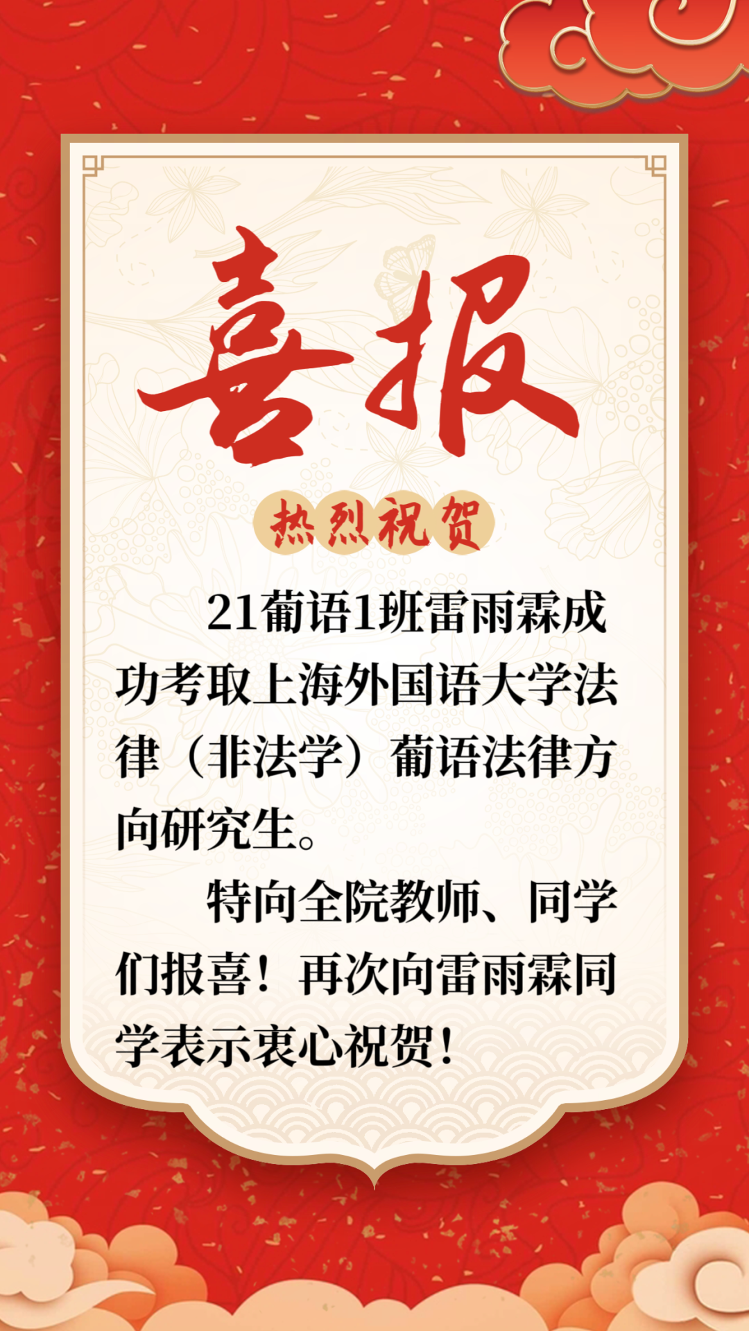 荣誉喜讯 | 21葡语1班雷雨霖成功考取上海外国语大学法律(非法学)硕士研究生(25年国内升学第4期)