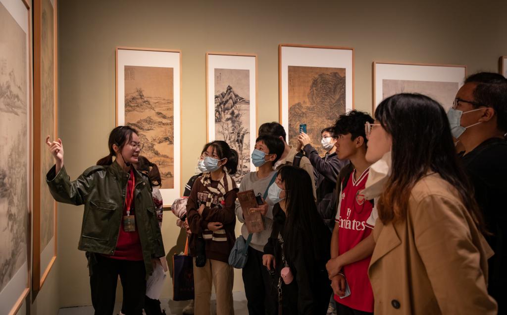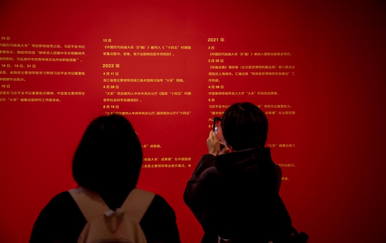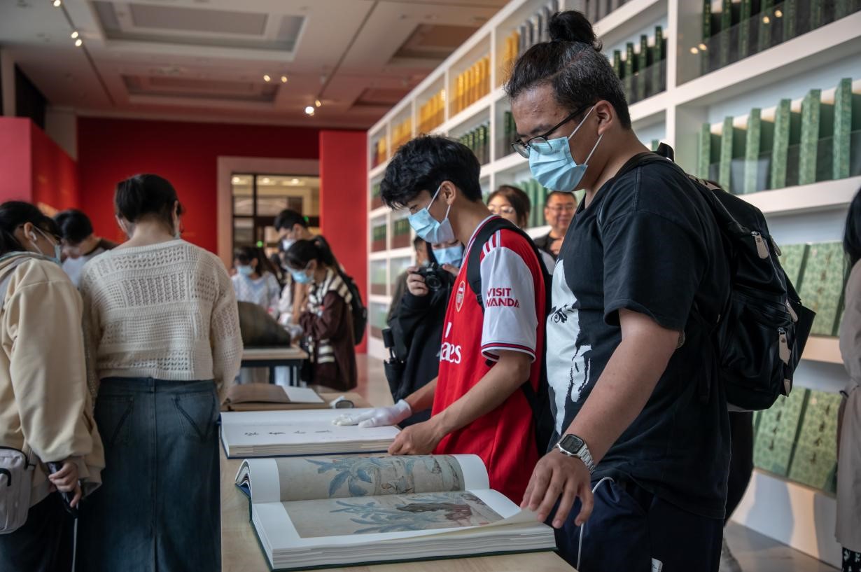318幅阅读、典籍、中外交流、耕读等主题绘画作品高精度打样稿、包括62册观众可直接翻阅图书在内的全套“大系" 230余册实体图书、“AR读画”创新展项……师生们在身临其境中感受“大系”带来的视觉盛宴,对国宝故事与传统文化魅力有了更深的体悟。