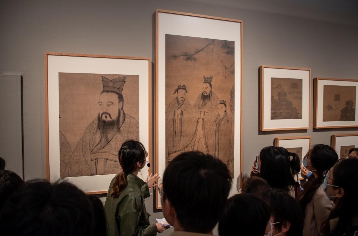 在“薪火相传,代代相守”展区,师生们被一本本精致、珍贵的历代画册典籍所吸引,惊叹“大系”项目组久久为功、精益求精的传承精神;在“书读百遍,其义自见”展区,师生们被局部放大数倍的《三圣图》中主人公衣服上清晰可见的满书小楷《论语》叹服,这是书法与绘画的和谐统一,更是艺术、思想与科技的和谐统一;在“文以载道,成风化人”展区,《乞巧图》《独乐图》《耕作图》等一幅幅国宝绘画生动展示了人与自然、人与社会的深刻智慧与丰厚哲理;在“丹青不渝,文脉密码”展区,AR游戏带我们走入《听琴图》,零距离观赏、聆听、“触摸”,沉浸式展厅《光影丹青》更是带领大家置身于古画的景、物、人,在身临其境中感受中国传统文化的魅力。