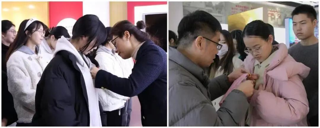 学院党总支书记毕莹、副书记戴力以及教师党员代表首先为新党员佩戴党徽。毕莹提醒新党员:党徽虽小,意义非凡,希望党员们牢记党员身份,自觉维护党员形象。