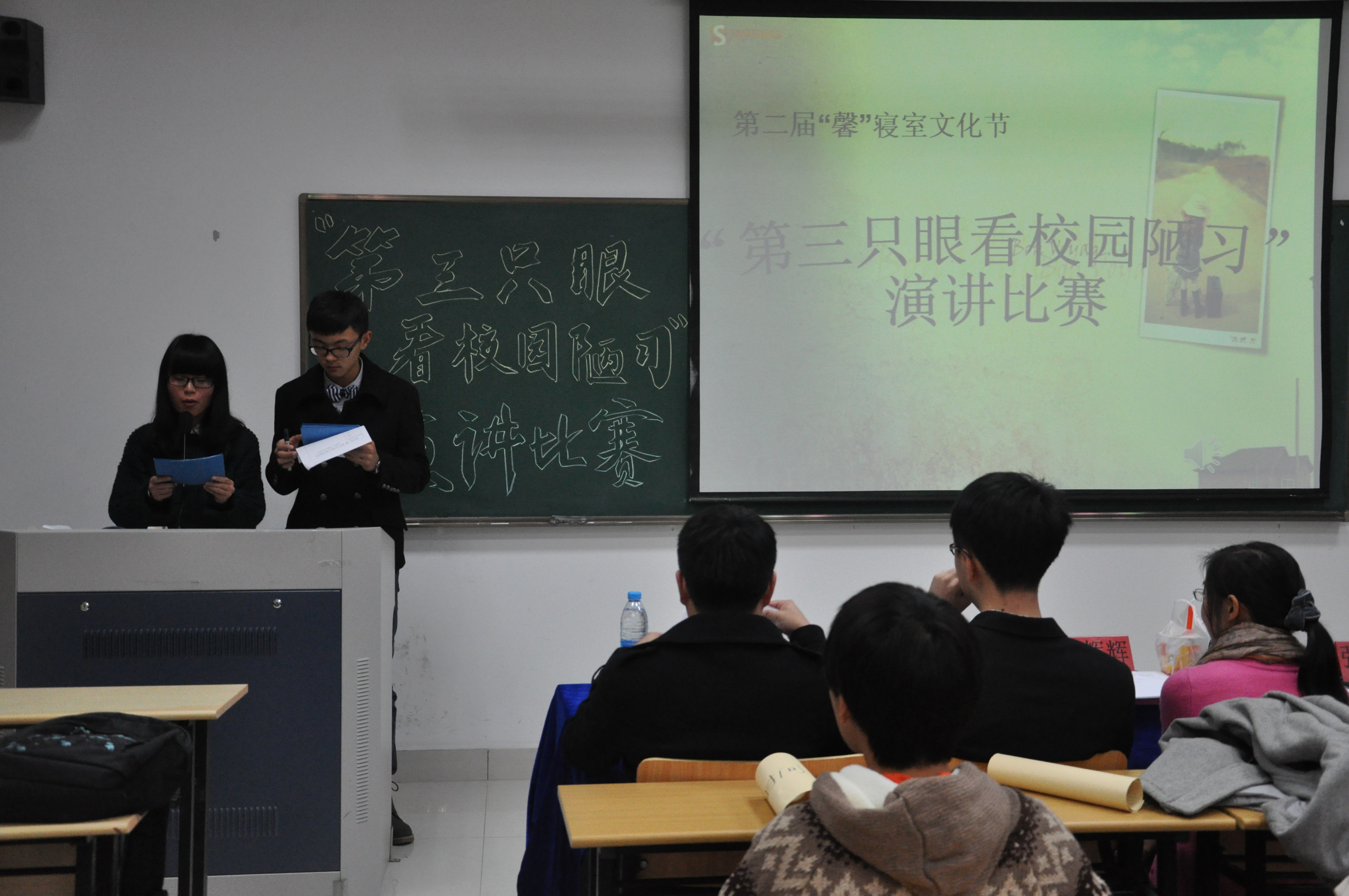 2013年11月24日晚上六点半,欧亚语言文化学院第二届“馨”寝室文化节演讲比赛在艺术楼A504教室举行。担任本次比赛的评委有欧亚学院陈和健老师,刘辉辉老师,中文学院邓健老师以及国际工商管理学院张宗讯同学。