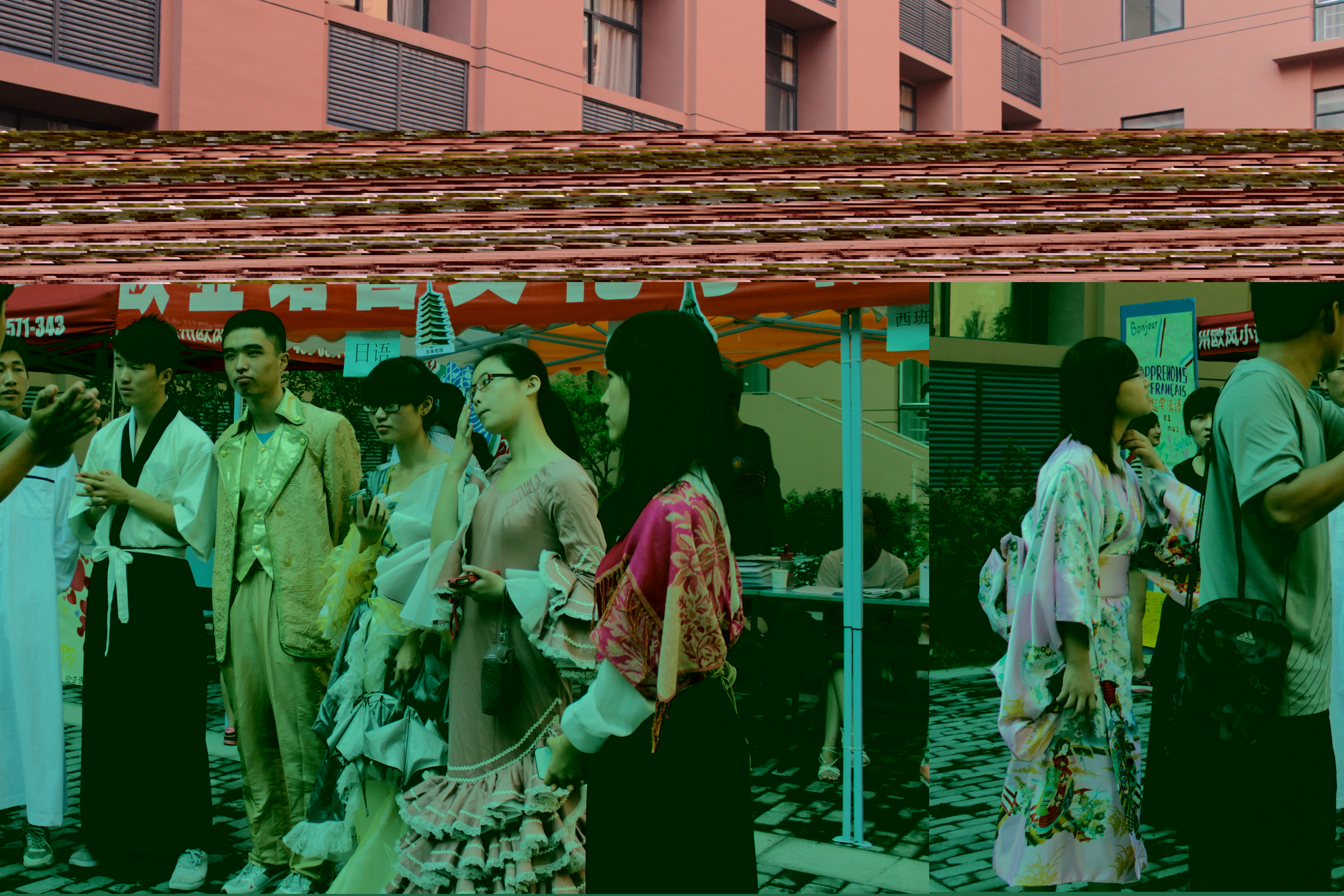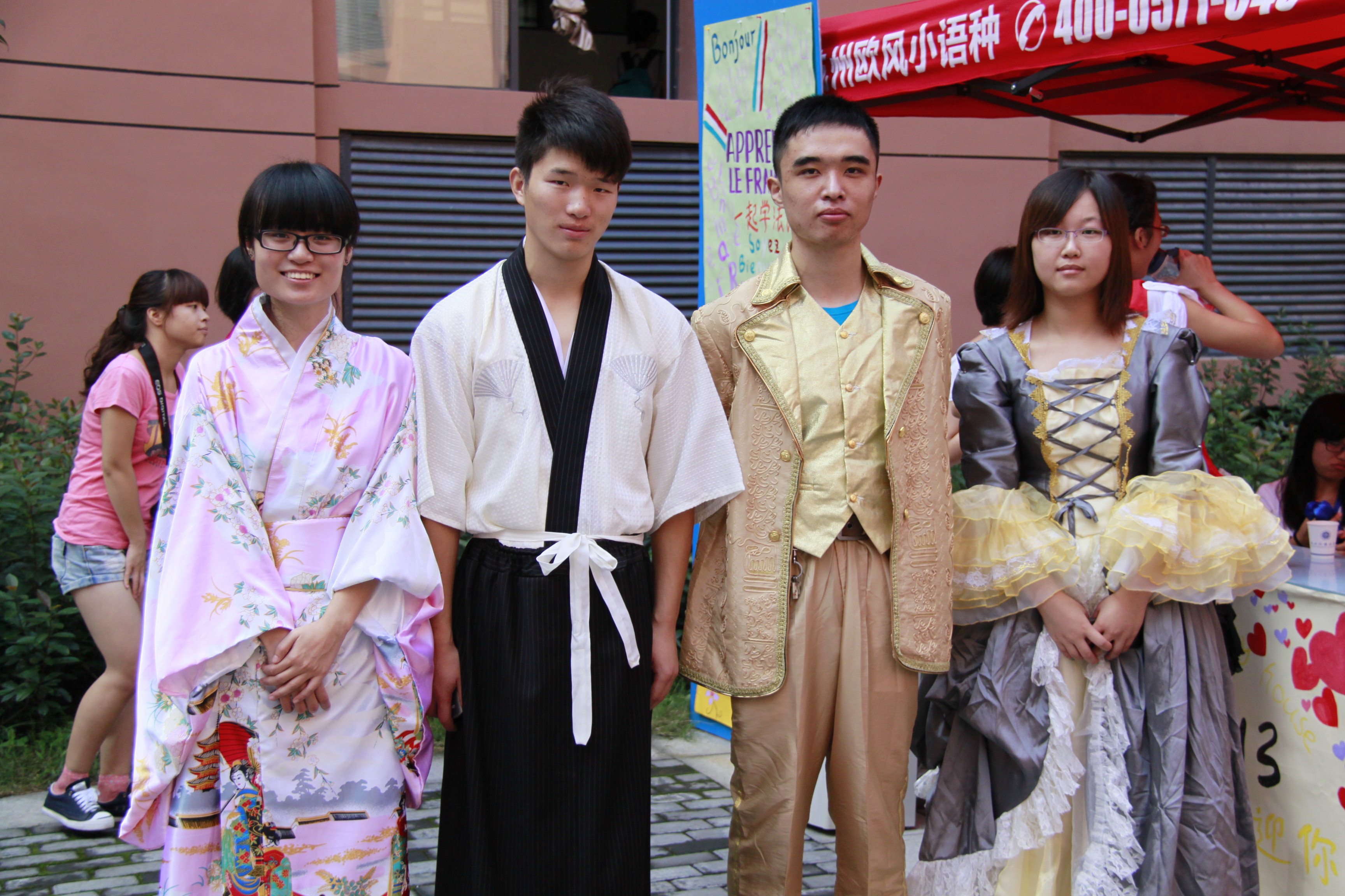 而作为欧亚学院的特色,多语种的融合在此次迎新活动中得到了充分的体现。法国和西班牙的宫廷服饰,日本的和服,阿拉伯的长袍,意大利和葡萄牙的特色服饰由班助穿着,还有由手绘的各个语系的海报,都让新生在报到的第一天感觉到欧亚学院多语言的特色。