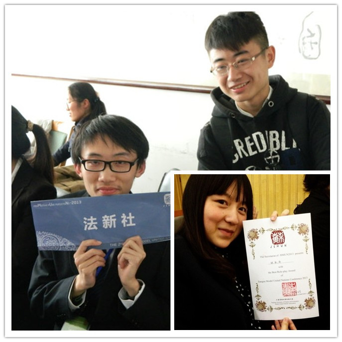 12日语、12法语专业学生,校模拟联合国协会成员张秋雨、张易、蒋书浩等四人参加了在南京财经大学举办的第二届江苏省模拟联合国大会。12日语2班张秋雨同学荣获“最佳角色扮演奖”和“最受欢迎奖”两项个人奖项,并与浙江科技学院、南京仙林外国语学校的代表合作获得了“最佳内阁奖”;12法语2班蒋书浩同学荣获“最佳调研文件奖”。这是我校模联协会第一次在全国性模拟联合国会议中获奖。