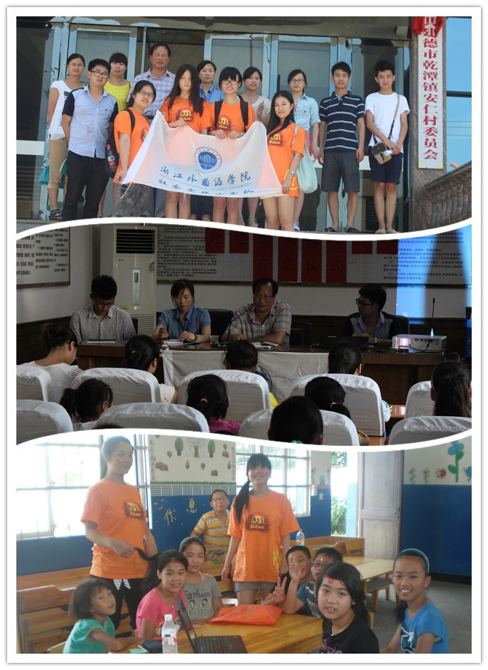 在之后的八天时间里,实践小分队成员将组织开展“暑期第二课堂”和“流动少年宫”活动,利用专业优势,做孩子们的“小老师”,为孩子们介绍世界各国风土人情,开阔孩子们的知识视野,同时,开展暑期安全自护教育、安全自救和互救技能体验等;关注并帮助实现留守儿童的“微心愿”。将配合建德团市委、乾潭镇团委,完善流动团员青年库,调研流动团员青年的思想、工作和生活现状。将开展文化宣传,通过黑板报、宣传单等宣传法律知识、环保知识和医疗卫生知识,丰富村民的文化生活,倡导科学、健康、文明的生活方式。我们还将走访浙江省文化示范村、杭州市文化示范村、杭州市农家书屋先进集体等,调研乾潭当地农村文化建设。