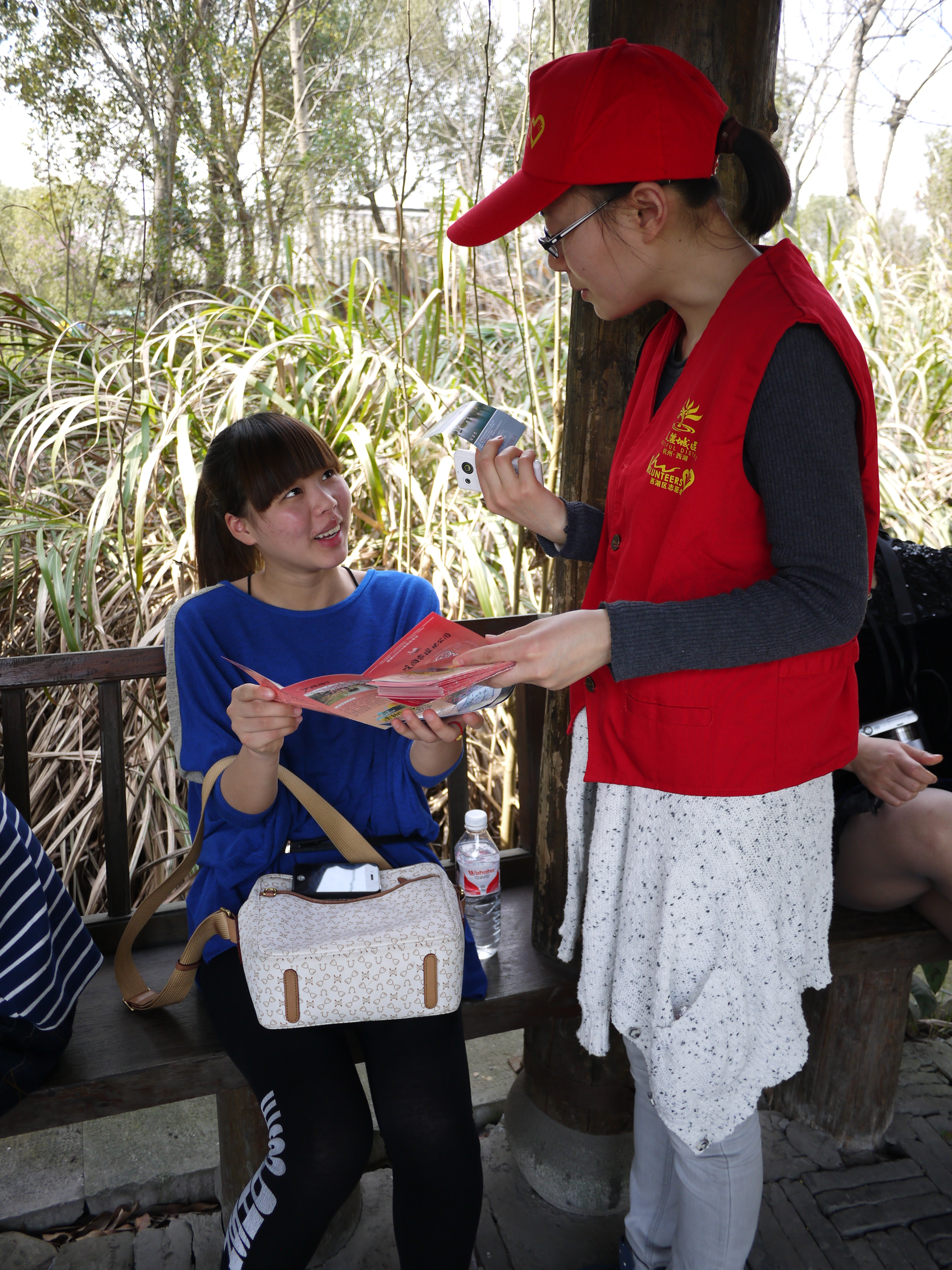 志愿者为西溪湿地的中外游客们提供了温馨的志愿者服务。