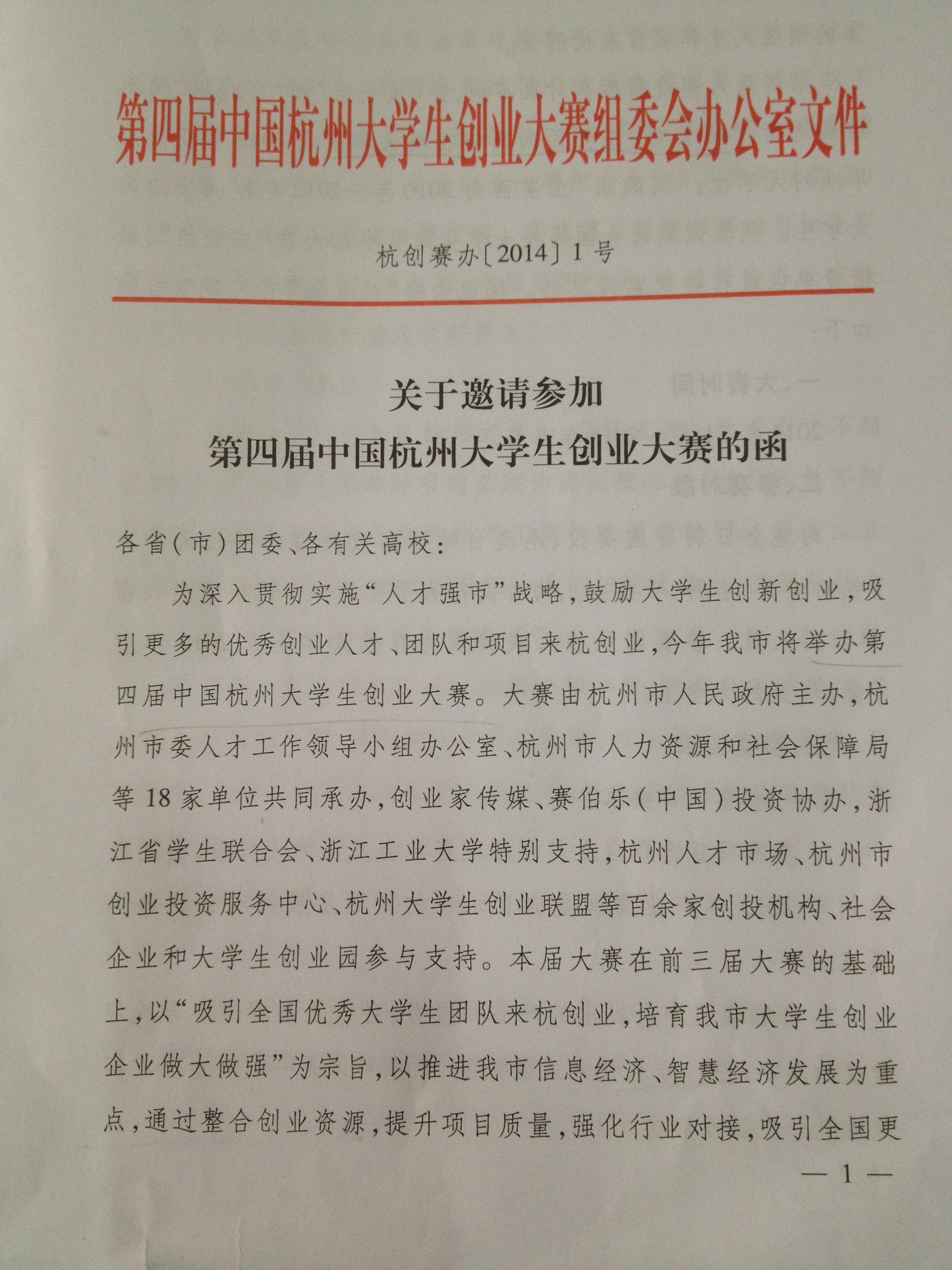 关于转发第四届杭州市大学生创业大赛的通知