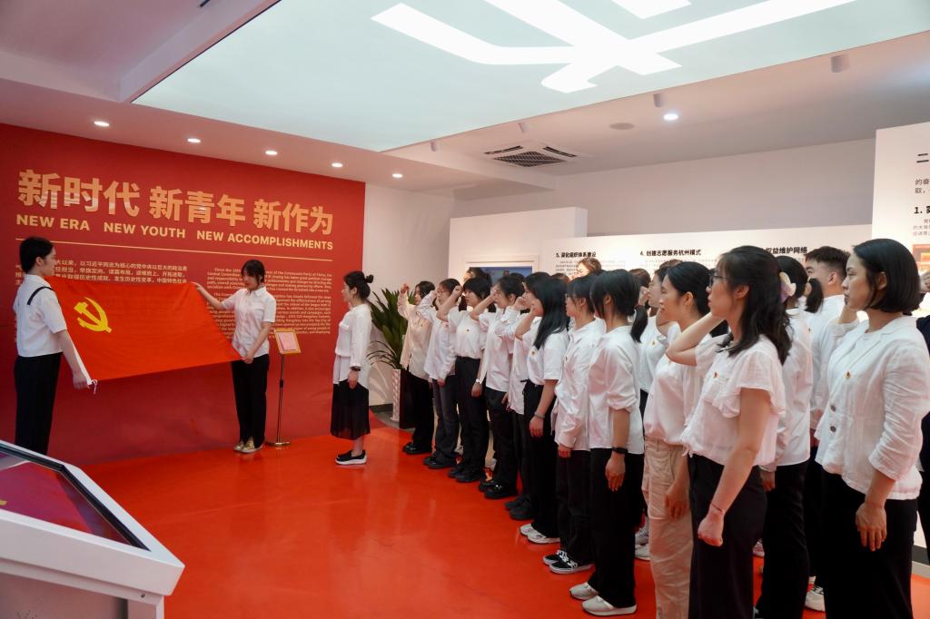 在杭州青年运动史馆内,鲜红的党旗熠熠生辉,新党员们面向党旗,神色庄重,右手握拳过肩,在党总支书记毕莹的带领下进行集体庄严宣誓,铮铮誓言铿锵有力,庄重承诺激荡回响,每一位党员都接受了一次深刻的党性教育和灵魂洗礼。