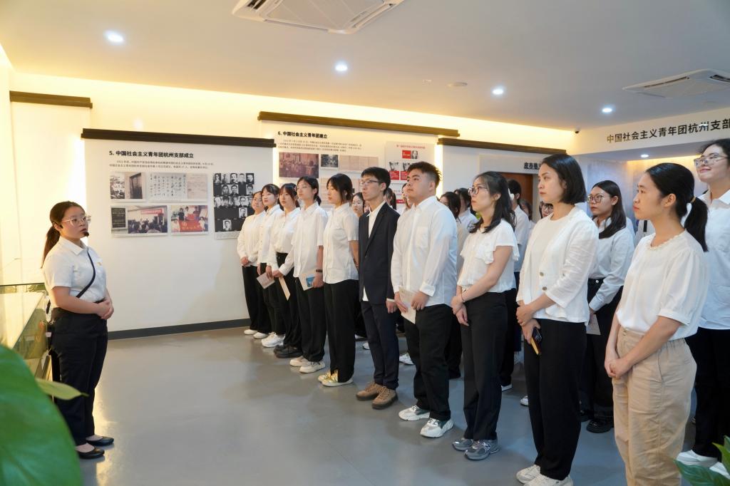 入党宣誓仪式前,师生们跟随讲解员在杭州青年运动史馆内进行参观学习。该馆展示了杭州青年在中国共产党的带领下,在中国革命、建设和改革开放时期不懈奋斗的辉煌历史和重要经验,为各位青年教师和青年学生提供了丰富的团史、党史理论学习资料。透过一张张黑白旧照、一件件珍藏展品,师生们仿佛走进时光的隧道,循着杭州青年运动的轨迹,回望杭州青年在新中国建设中努力奋斗的身影,真切感受他们的革命精神。