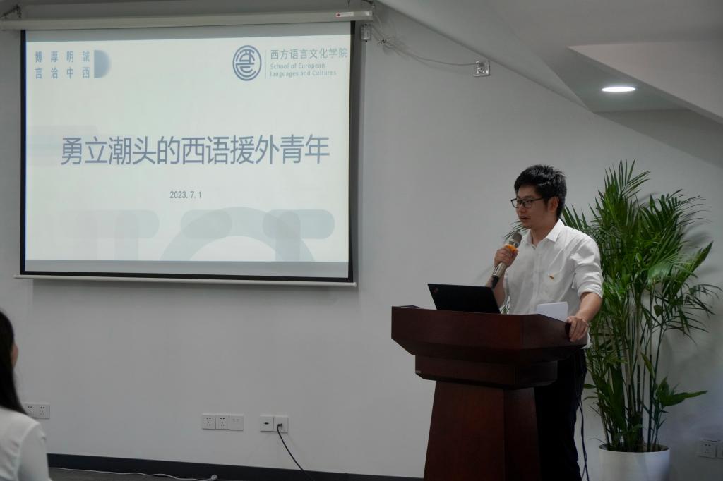 “他四次远渡重洋,用法语架起中非友谊的桥梁,将青春献给60年来一直为推动构建人类卫生健康共同体而奋斗的中国医疗团队,为中国医疗团队提供最准确、便利的翻译”,学生第二党支部书记陈相伟作为“八八战略”在身边“90”宣讲员,为新党员们讲述了勇立潮头的西语援外青年的故事。参加援非项目过程中存在着处境危险、环境恶劣、通讯不便、物资缺乏等重重困难,2017届法语专业毕业生党员唐伟杰却从未止步退缩,一次又一次坚定地选择了援非医疗翻译工作。19届法语专业毕业生杜新玉服务中国旅法勤工俭学法国蒙达尔纪纪念馆;20届法语专业毕业生封梦骄参与天津市援刚果(布)医疗队;20届西班牙语专业毕业生夏慧圆外派援助赤道几内亚电视台,担任赤道几内亚领导人会面活动翻译;22届德语专业毕业生陈飞宇服务于加纳大学孔子学院,一位位外语青年党员牢记青春使命,于世界各地用行动践行着青春誓言。