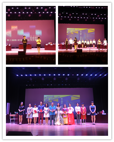 文化节开幕式在东、西语学院学生9种语言声情并茂的表演中拉开帷幕,他们集体朗诵了题为《爱与西风》的精彩节目。紧接着,两个学院成立的“日语协会”、“奔跑吧!羚羊! ——阿语社” 、 “ 雅言韩语社”、“法语社” 、“拉美书院” 、“大放意彩——意大利语社” 、“俄语社”等八个专业学习延伸类社团学生负责人登台举行拜师仪式,他们分别给自己的指导老师们颁发了聘书。