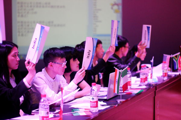 20名浙外优秀青年学子分别扮演G20国代表团围绕“国际能源现状与合作”的主题进行了激烈的辩论和交流。所有“与会国”在致力于改善国际能源现状、促进国的能源合作上达成一致意见,呼吁建立世界能源发展组织,旨在促进全球性政府间的能源开发、利用、贸易等方面的合作,最大程度地提高整个能源价值链以及促进新能源的开发与利用。“代表国”在海洋资源安全、污染防治保护以及传统能源的保护上留有争议。