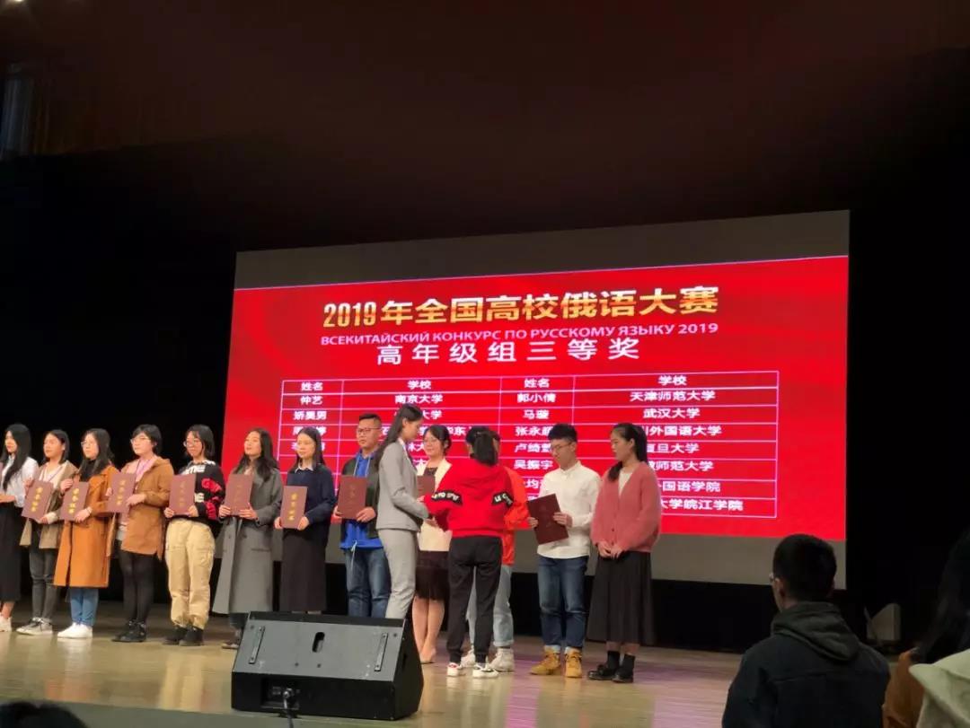 10月26日,2019全国高校俄语大赛在北京外国语大学举行。在西语学院李磊荣与孔琳老师的指导下,2016级俄语专业学生余均涛获高年级组三等奖,2018级俄语专业学生王梦雨获低年级组入围奖。国家留学基金管理委员会秘书处将全额资助余均涛赴俄罗斯攻读学位。