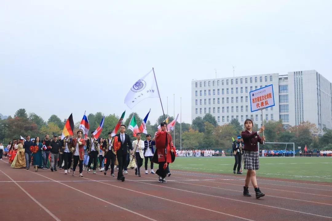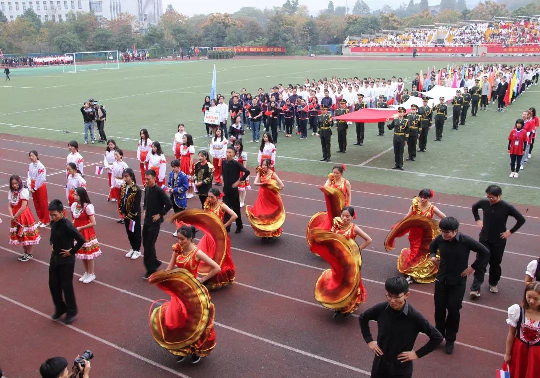 在澎湃激昂的进行曲与铿锵有力的解说词中,西语学院学子们身着鲜明艳丽的服饰,踏着整齐划一的步伐走上跑道。他们身着各国风格浓厚的服饰,手持鲜艳的旗帜,一举一动无不彰显出西语学院的国际化特色。行至主席台,他们向各位领导致以崇高的敬意。伴着清扬欢快的音乐,他们跳起优雅而又活泼的风情舞蹈,飞扬的裙摆间尽显西语学院独特的风采。