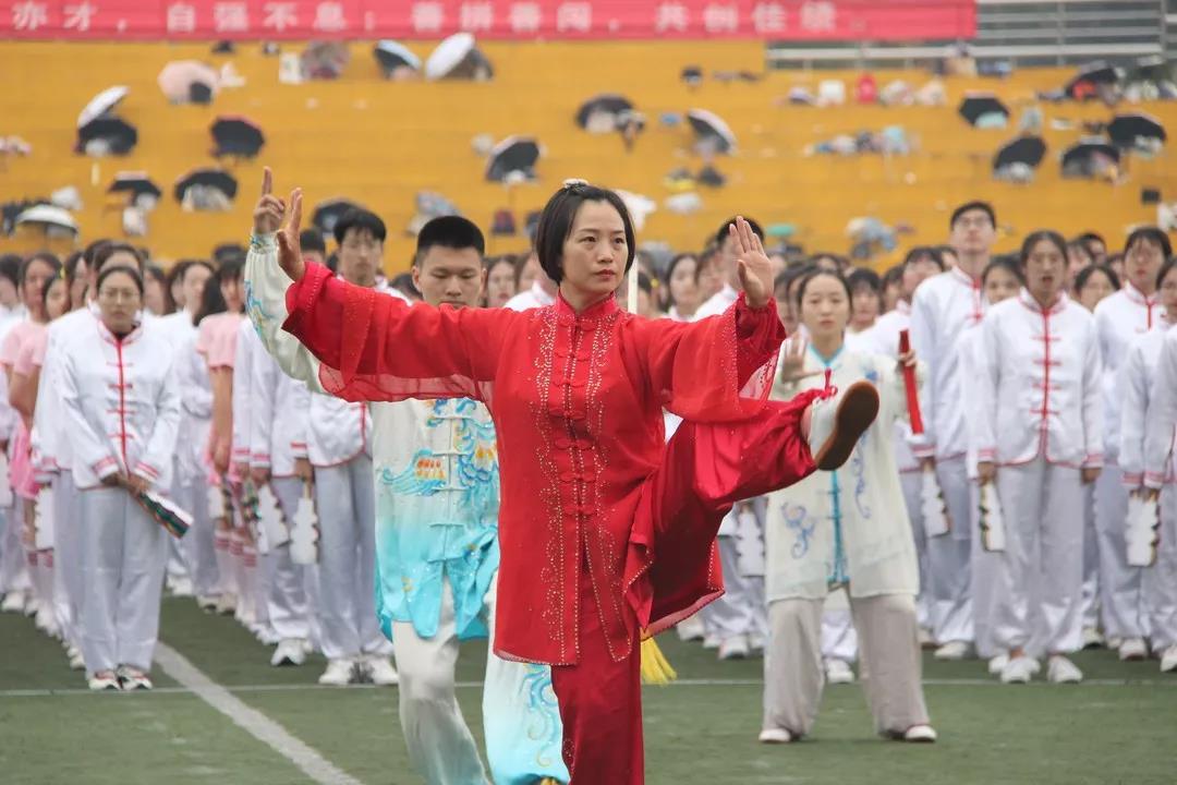 学子们的太极拳与健美操表演。一静一动,一推一收,太极拳表演队的学子们一招一式间尽显太极文化的精髓与魅力,所有的动作都自然又恰到好处。健美操表演队的学子们身着热情的红色,手持闪亮的花球,跟随韵律欢快起舞。她们青春的身姿,悦动的舞姿是力量与柔美的结合,是活力与激情的体现。