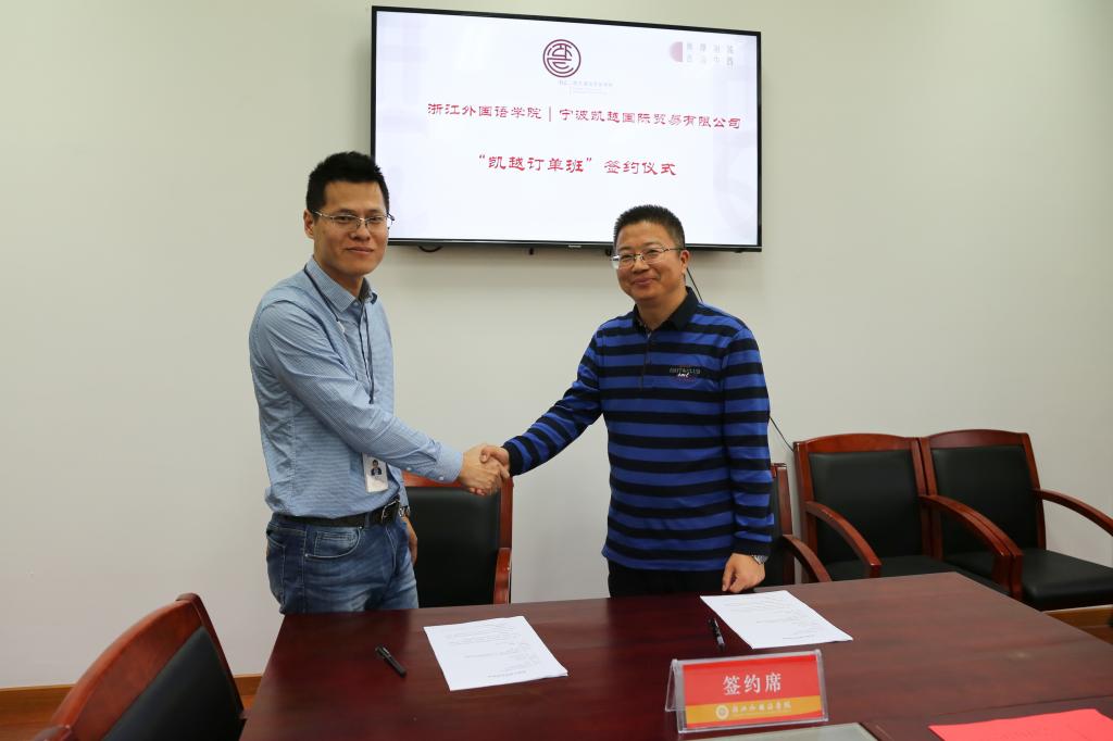 11月14日下午,宁波凯越国贸集团与我校在融院D408会议室举行了订单班签约仪式。副校长柴改英、宁波凯越集团董事朱吉一行、西语学院领导班子出席了此次活动。西语学院副书记顾小明主持。