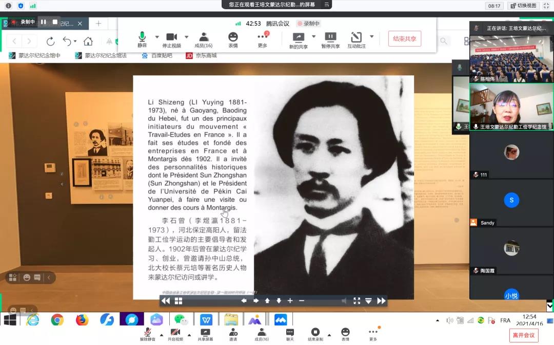 “现在我带大家看一下蒙达尔纪火车站的前坪广场——邓小平广场......”王培文以线上VR直播的方式带领大家“云游”中国旅法勤工俭学蒙达尔纪纪念馆,展示了诸多珍贵的史料,重温周恩来、邓小平、蔡和森、陈毅、聂荣臻等进步青年远渡重洋来到蒙达尔纪市这座带有“红色印记”的法国小城,以半工半读的方式寻找民族救亡图存之路的感人经历。王培文指出,中法两国虽相隔万里,中法友谊却源远流长。