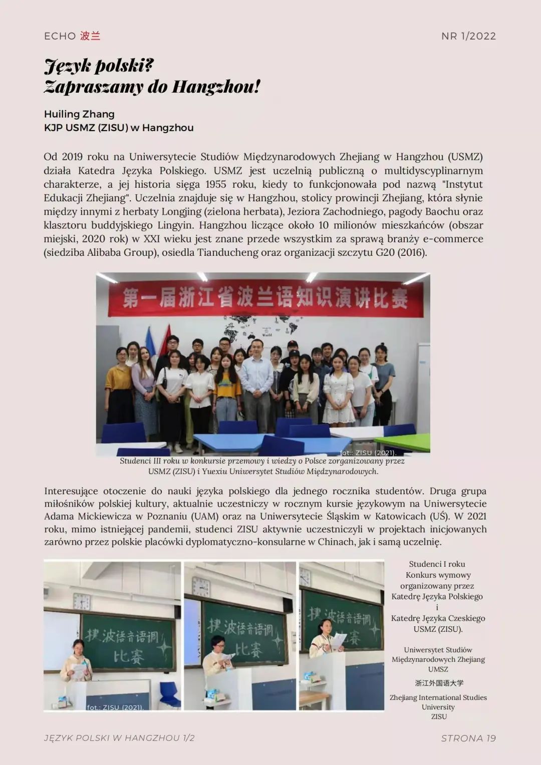 近日,由波兰共和国驻上海总领事馆发行的全新《Echo波兰》杂志刊登了波兰语专业张慧玲撰写的介绍学院波兰语专业建设与学生风采的中波双语文章。文章以图文并茂的形式介绍了学院波兰语专业的基本情况、波兰语专业学生参加各类比赛、翻译新闻及参与公众号建设的积极表现。