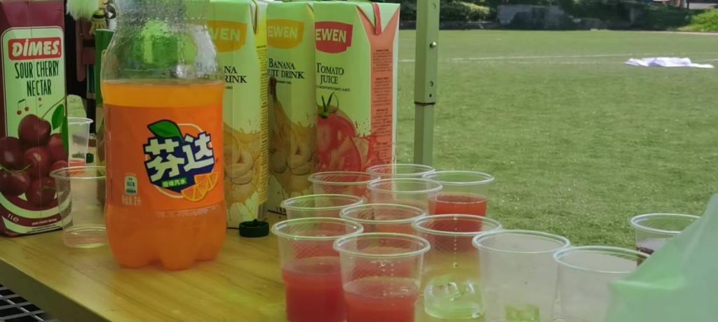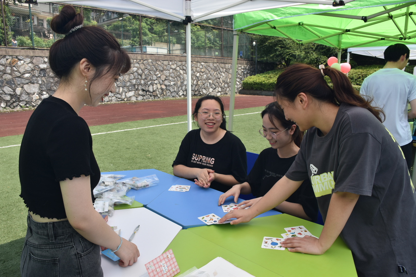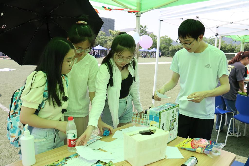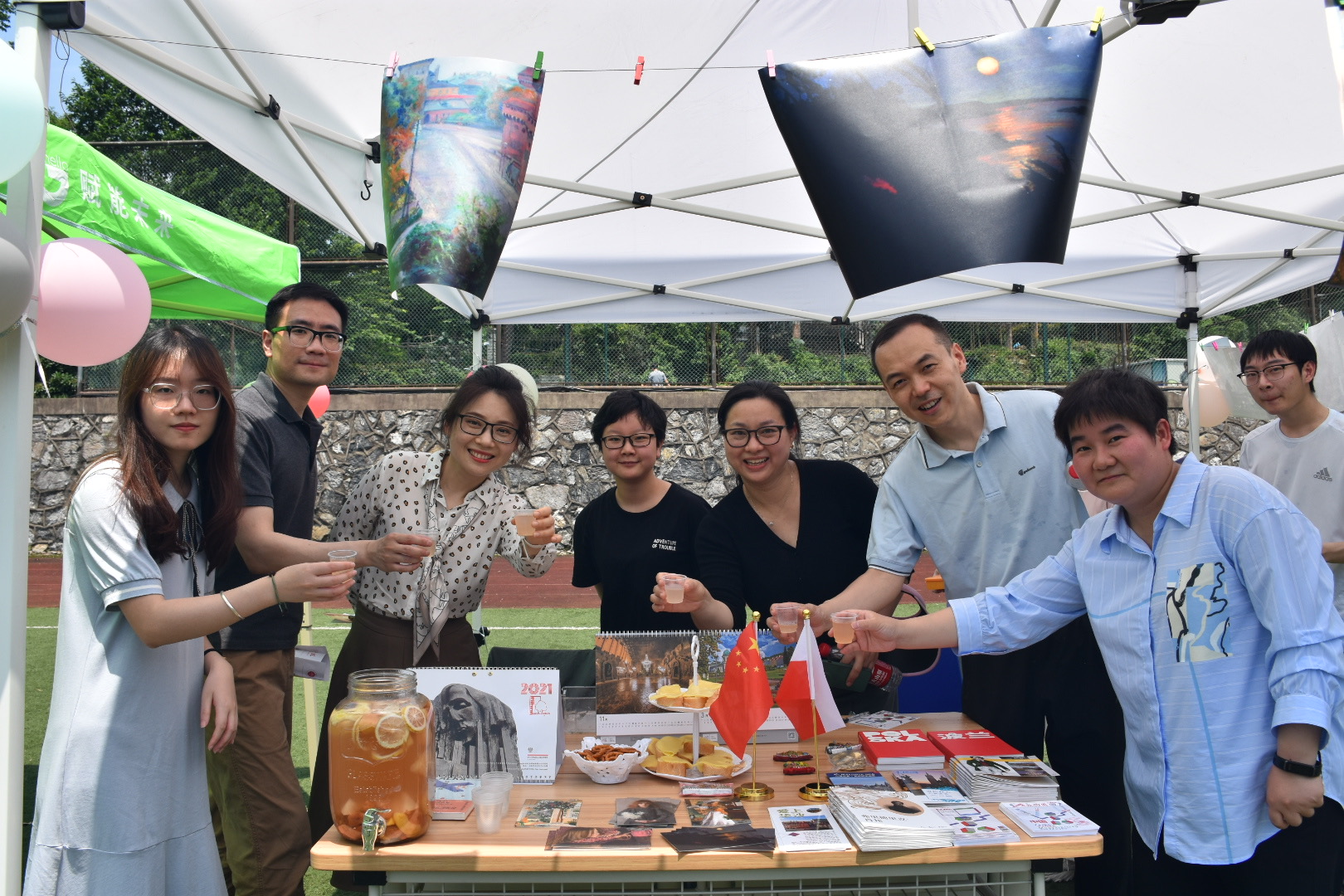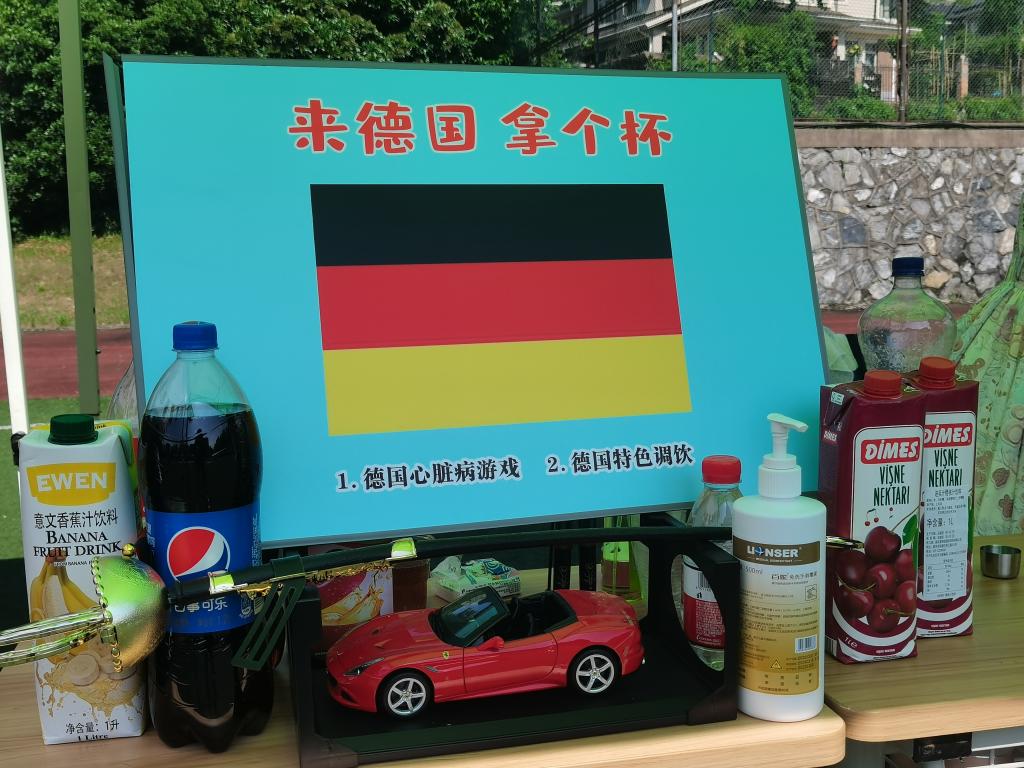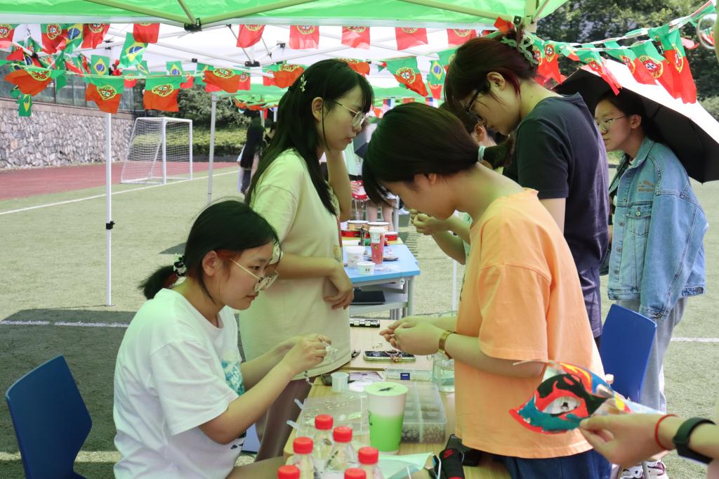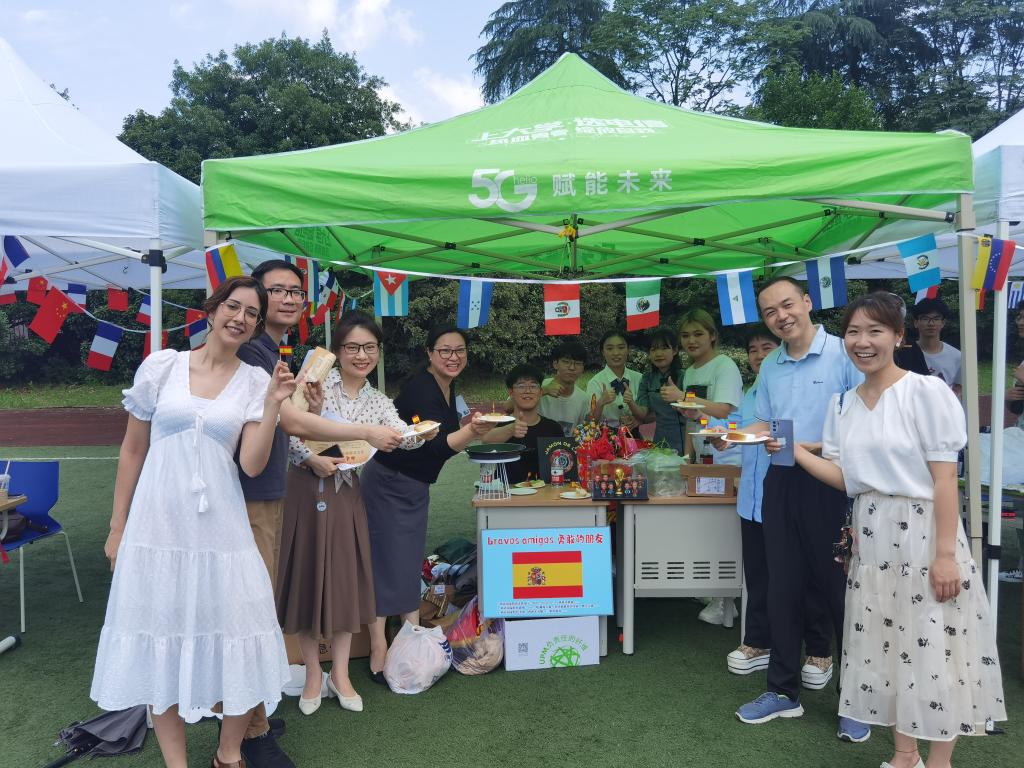西班牙摊位一首首动听热情的西语歌曲也响彻整个足球场,更有外教老师与同学们的欢乐对唱;