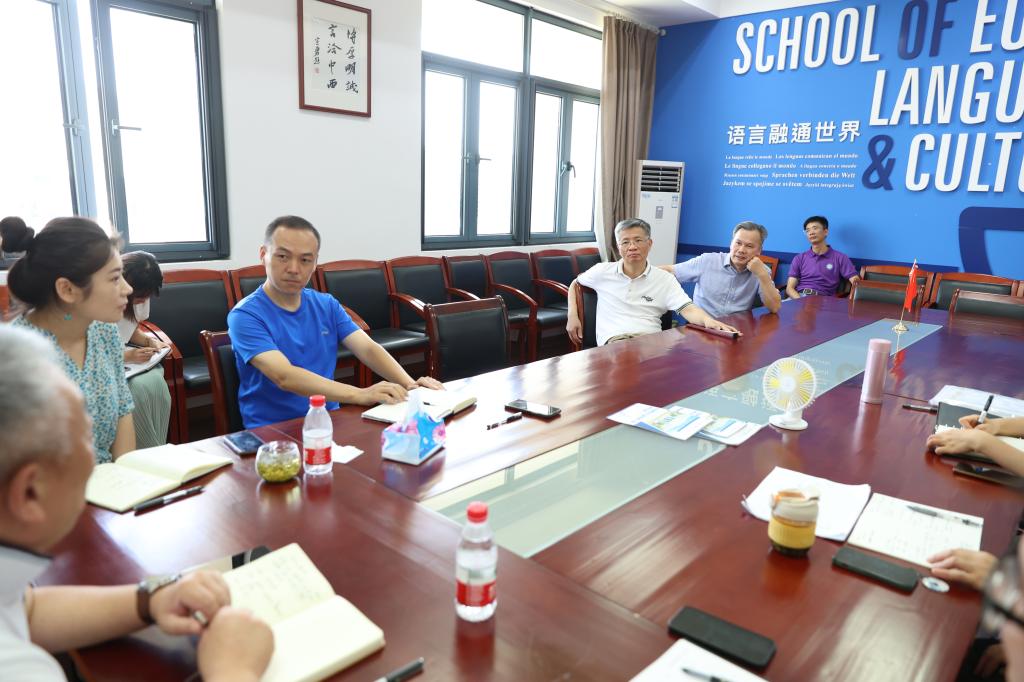 在学院会议室,宣勇书记亲切看望正在召开暑期定期工作会议的学院班子成员和教职工,代表学校向学院各线利用假期研究推进工作表示衷心地感谢和慰问。他肯定了学院在暑期专题研讨、定期研究和及时推进的工作思路,就如何做好做强学院社会服务等工作进行了指导。宣勇指出,学校社会服务工作需要多语种的积极参与,学院要主动将语言融通到跨专业、多领域的服务合作中;学院事业建设的团队要多研讨多碰撞,探讨适合发展的道路;各专业要探索专业建设和研究相结合的发展道路;学院要积极统筹谋划招生工作,积极营造学院全体、尤其专业教师积极主动关注招生质量的良好氛围。宣勇关心叮嘱学院教职工合理安排时间,注意防暑降温,特别是要注意暑期疫情防控和出行安全,积极推动学院人才引进、教学建设、社会服务等方面工作。