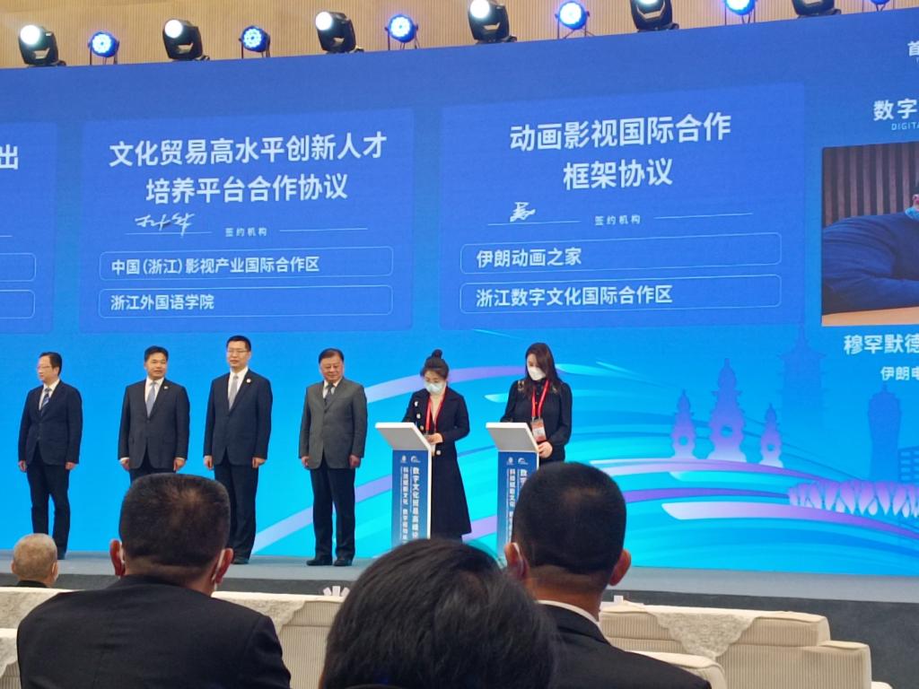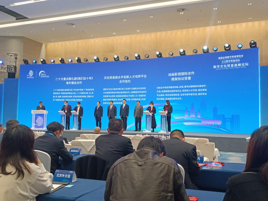 12月12日,学院党总支书记毕莹,校社会合作处副处长卓雪冬,以及学院副院长张禄彭受邀参加了参加了首届全球数字贸易博览会、之江数字贸易论坛。会上毕莹代表学校与浙江华策影视股份有限公司、中国(浙江)影视产业国际合作区签订三方合作协议,建立影视国际传播实践基地,聚焦影视国际传播合作与人才培养。