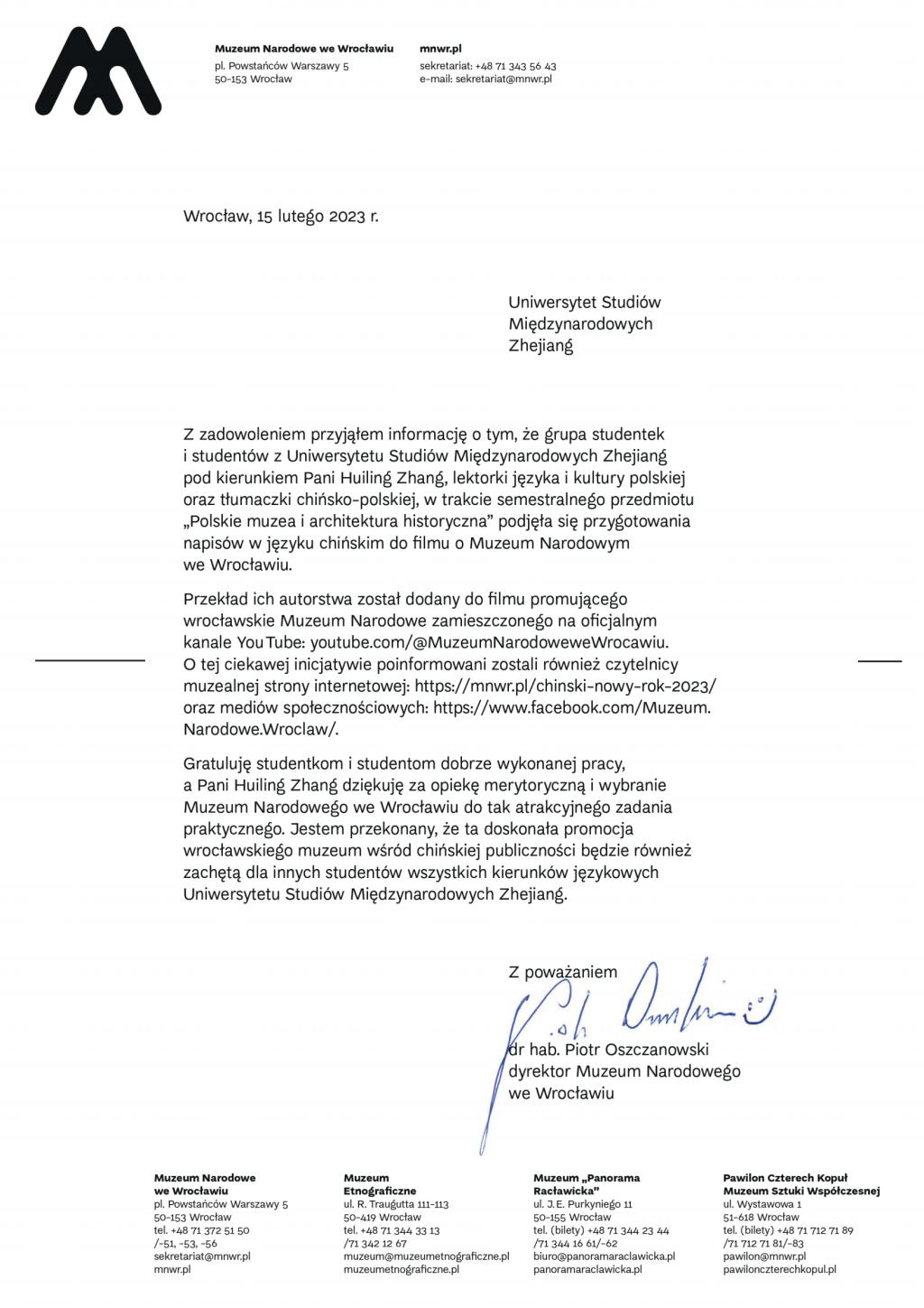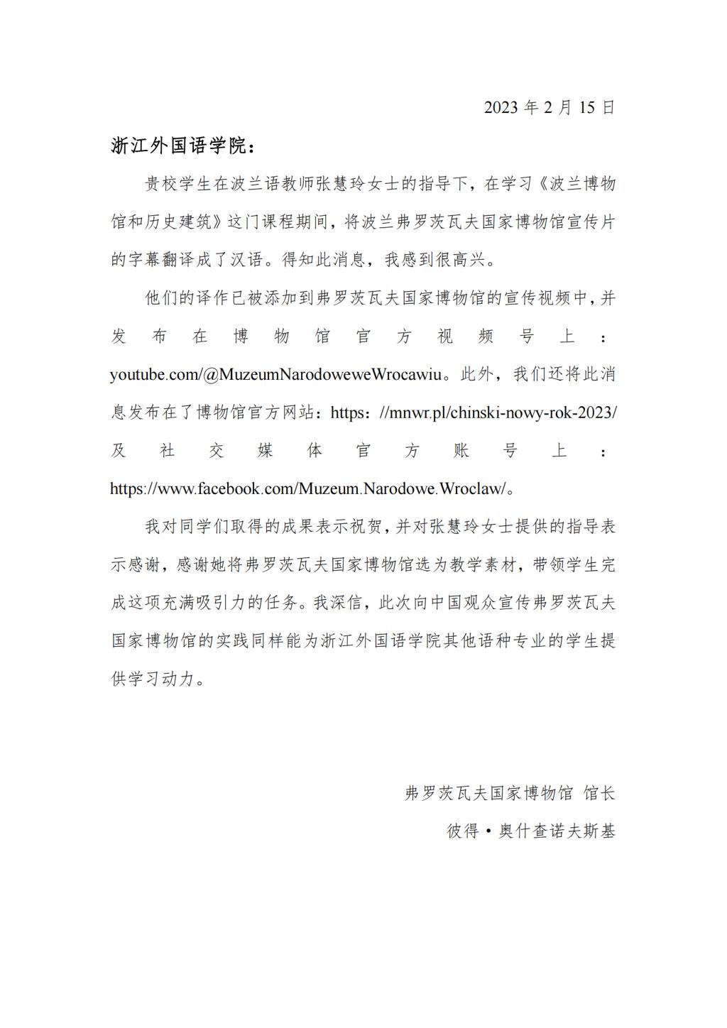 近日,波兰弗罗茨瓦夫国家博物馆向我校发来致谢函,对由我校波兰语专业师生负责完成的博物馆宣传片视频(中文版字幕)翻译工作表示感谢。