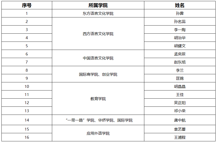 近日,学校公布2022年“弘毅英才”评选结果,经个人申报、所在单位推荐、资格复查、校内外专家评审、院长办公会审定,学院俄语系孙名蕊、西班牙语系李一陶、葡萄牙语系胡治华、意大利语胡健文4名教师成功入选“弘毅英才”。
