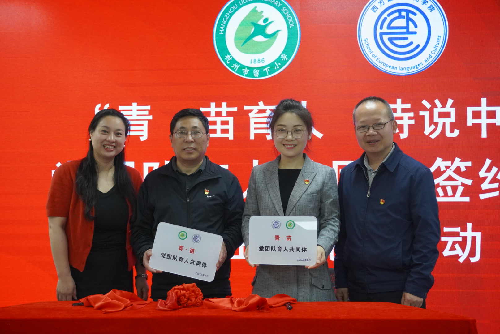 西语学院党总支和留下小学党总支,签订了“‘青·苗’党团队育人共同体”党建联建协议。留下小学党总支书记郑杭明、校长孔庆根,学院党总支书记毕莹、党总支副书记方盼等40余位师生代表,参加签约仪式暨首场党建联建主题活动。