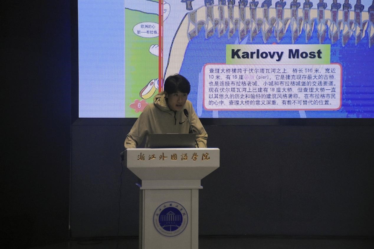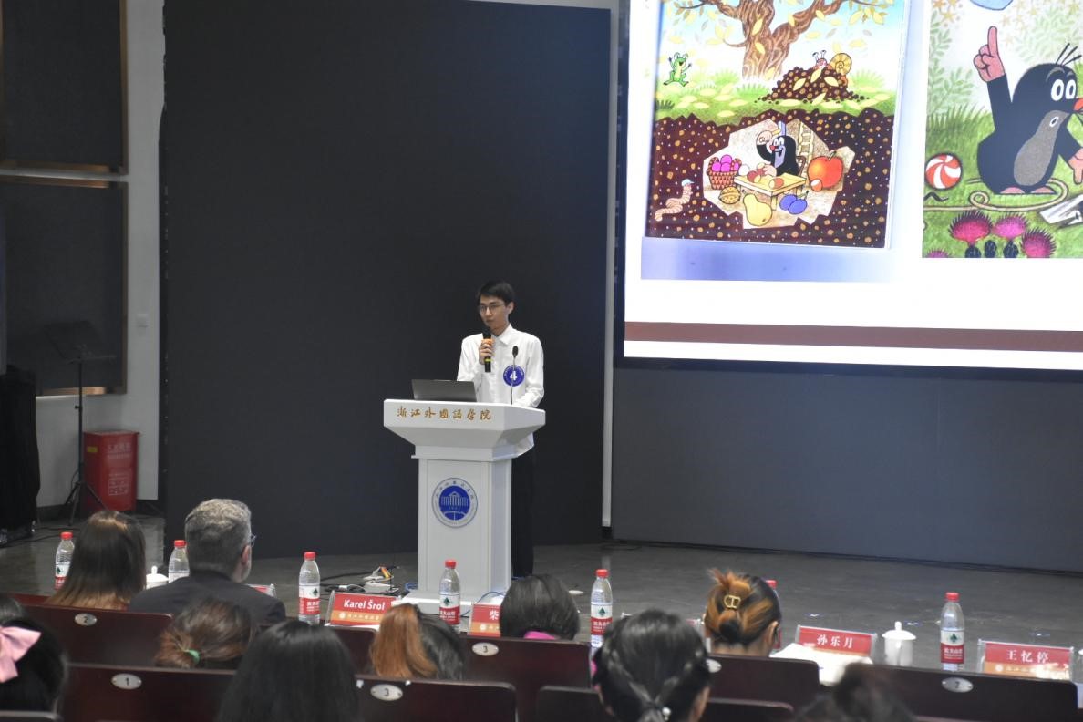 比赛中,来自上海外国语大学的何家珅作为一号选手拉开本次比赛的序幕。他走上讲台侃侃而谈,讲述了自己因童年的杂志与捷克结缘的故事。童年的他或许还不知道,随着伏尔塔瓦河奔流而来的不仅是捷克的哥特式城堡、查理大桥、圣维特大教堂,还有此后与捷克语妙不可言的缘分。回忆收到捷克语录取通知书的场景时,他说:“当我得知我被录取学习捷克语时,我翻了很多旧书,找到了这本杂志。我感觉自己回到了孩提时代,求知若渴。与此同时我也意识到,这可能就是我与捷克之间的神秘联系吧。”