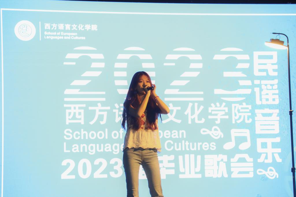 包括2023届毕业生在内的学院25位师生,在2个多小时的音乐陪伴中,演唱了21首中外民谣歌曲。即将毕业的王振杰、饶云龙2位学长,分别带来了《J'entends siffler le train》《les champs elyseés》《恋曲1990》等歌曲。蒙珮娸同学献上一曲《free loop》,时间将会证明一切,我们终将改变世界。金晨阳同学抱着吉他自弹自唱了《后来》。岁月中夹杂着太多的“多年以后”,但一刀一刻的记忆无所谓虚实,即使没有冰块,也没有马孔多。
