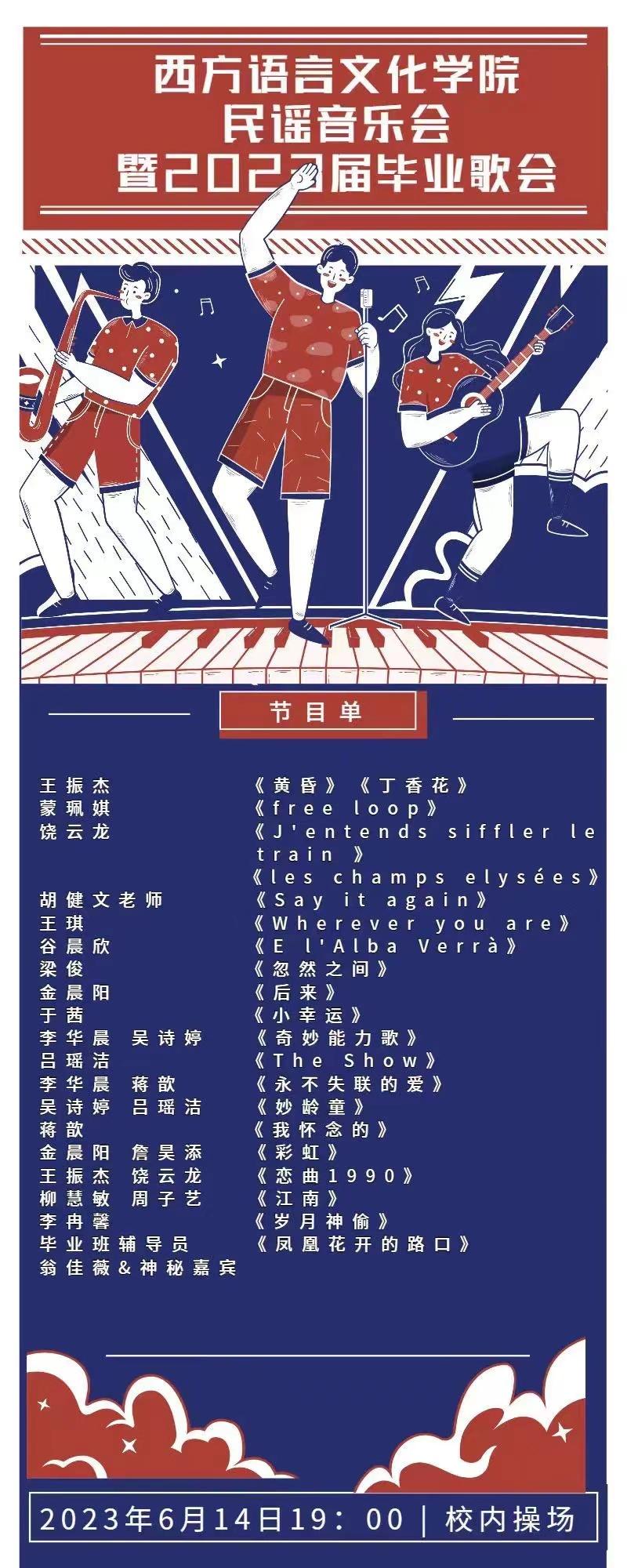 6月14日晚7点,西语学院民谣音乐会暨2023届毕业歌会于校内操场举行。学院党总支副书记方盼,学工办全体辅导员老师、学院教师代表,以及学院2023届毕业生、毕业生家长、在校生们共同到场参加音乐会。
