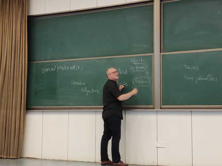 小说是一个复杂的宇宙,因为目光和视角在其中交织,多声的对话和表述在其中纠缠。借助叙事的不同模式,作者把读者带入主观世界,而这个世界是现实经验难以企及的。在讲座中,乐尔教授以叙事学的角度、从各个文本出发,阐述了小说叙事的各种视角、各种引语的变化以及小说中的复调多声问题。他以生动的语言把听众领入了一个别样的文学天地,在座师生听得饶有兴味。法语系徐普老师对讲座中的关键词汇和难点进行了现场翻译。乐尔教授在回答了听众的问题之后来到法语系办公室和法语系的教师进行了交流,探讨了法语系与勃艮第大学合作的前景。