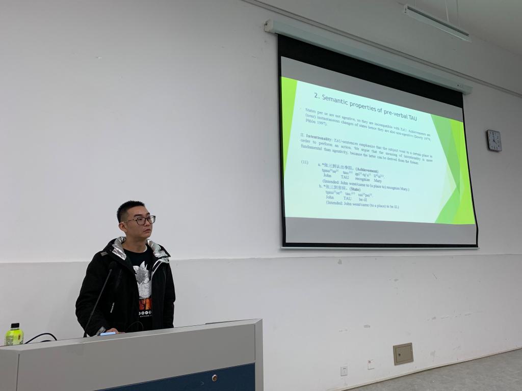 德语系讲师、语言学博士王继新以湘语小龙门方言的动词前TAU为例,讲述地点非耦合性引发的完成体研究。