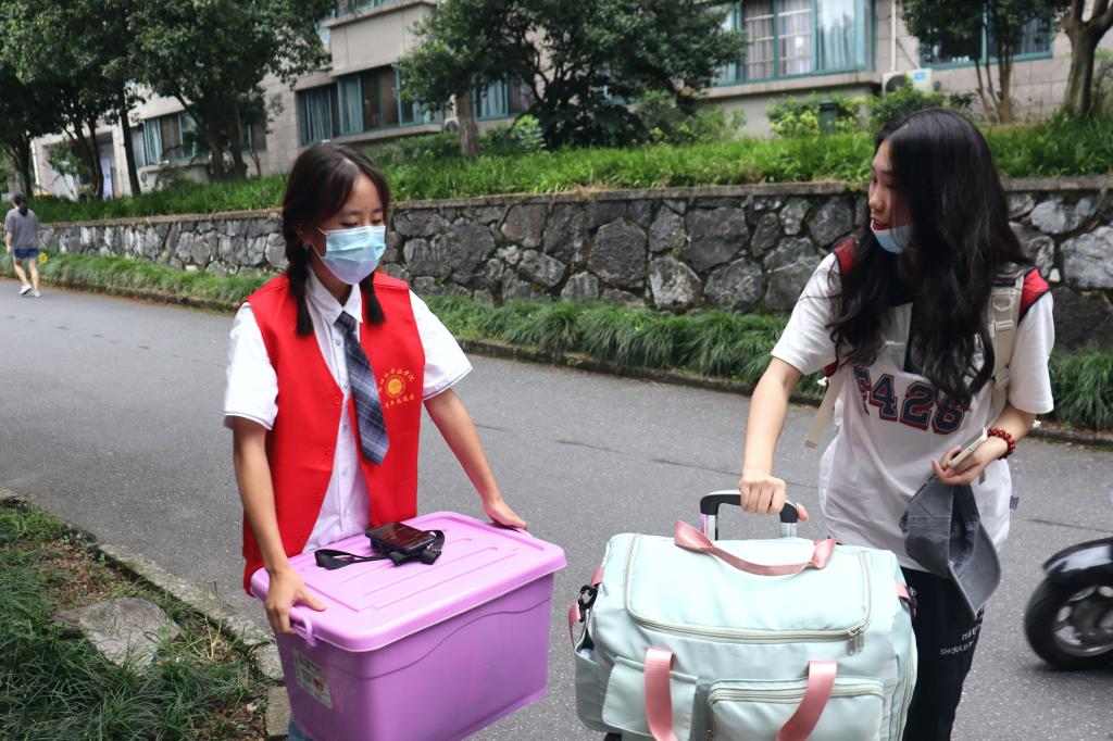 本次新生报到由老生志愿者精准接待。面对初次见面的学弟学妹,志愿者们不仅热心帮忙搬运学弟学妹手中的行李到寝室,还在沿途耐心地为他们解答各类疑惑。部分热心的学长学姐更是带着他们游转浙外,将校园美丽的风景尽收眼底。