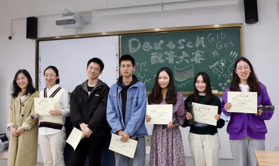 所有小组配音完成后,根据评委打分现场评选出一、二等奖各一组,三等奖两组,优胜奖三组,特等奖三组。其中戴煜雯小组配音的《疯狂原始人》荣获一等奖,林邦雷小组配音的《寻梦环游记》荣获二等奖,他们用精确流利的德语表达、无缝衔接的团队配合、符合配音素材人物的音色语调,诠释了一个完美的配音作品,收到全场参赛选手和评委老师的认可。在宣布所有获奖名单后,由各位评委老师为其颁发获奖证书,并与在场所有学生合影留念。