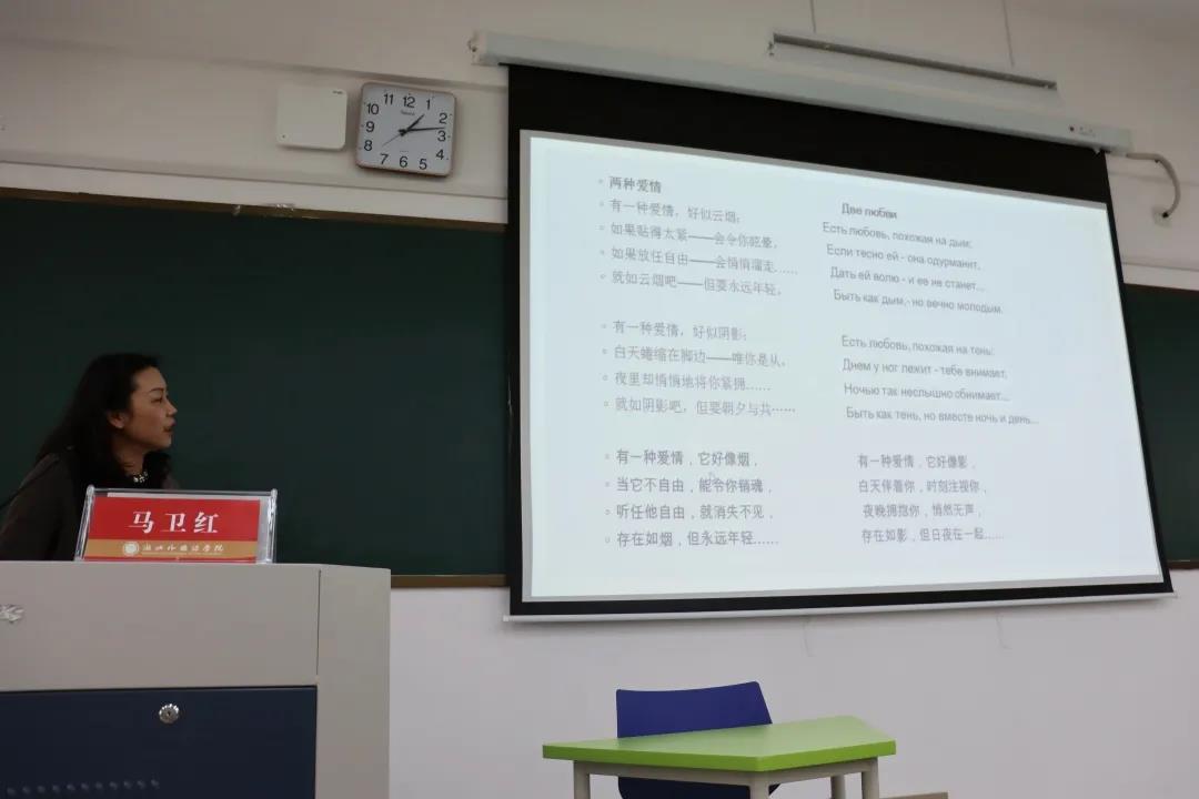 4月15日,西语学院在融D202举行“诗歌翻译漫谈”主题讲座,俄语系马卫红教授主讲,西语学院党总支副书记顾小明主持。