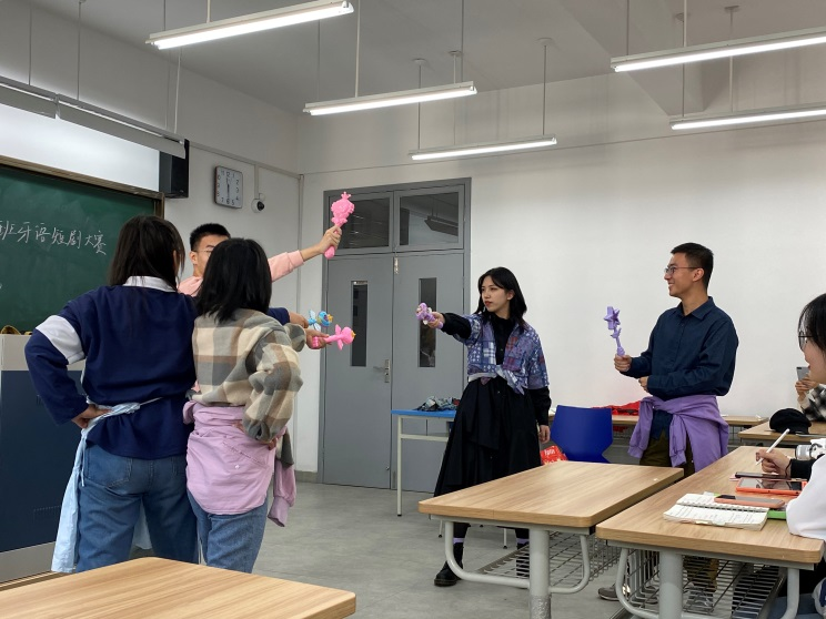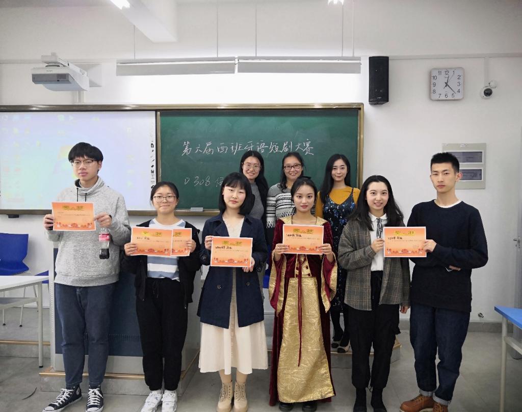 上午9点,短剧大赛正式拉开帷幕。开场的剧目《花木兰》小组,服装精美、故事情节完整,赢得了老师和同学们的阵阵掌声;紧接着同学们还表演了《伊比利亚大婚》、《唐璜》、《人生如梦》等极富西班牙文化色彩的剧目,让大家在学习之余对西班牙文化有了更为直观的了解;当然,也少不了诸如《小红帽》这样的传统剧目;更有小组对《回家的诱惑》、《一起来看流星雨》、《还珠格格》等国人熟知的剧目作了改编,令在场的所有人耳目一新。
