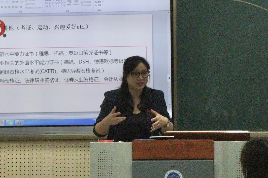 在教师分享环节,活动邀请了德语系主任章吟老师和辅导员翁佳薇老师,她们分别结合自己的大学经历与工作经验,提出了课外时间规划的建议。