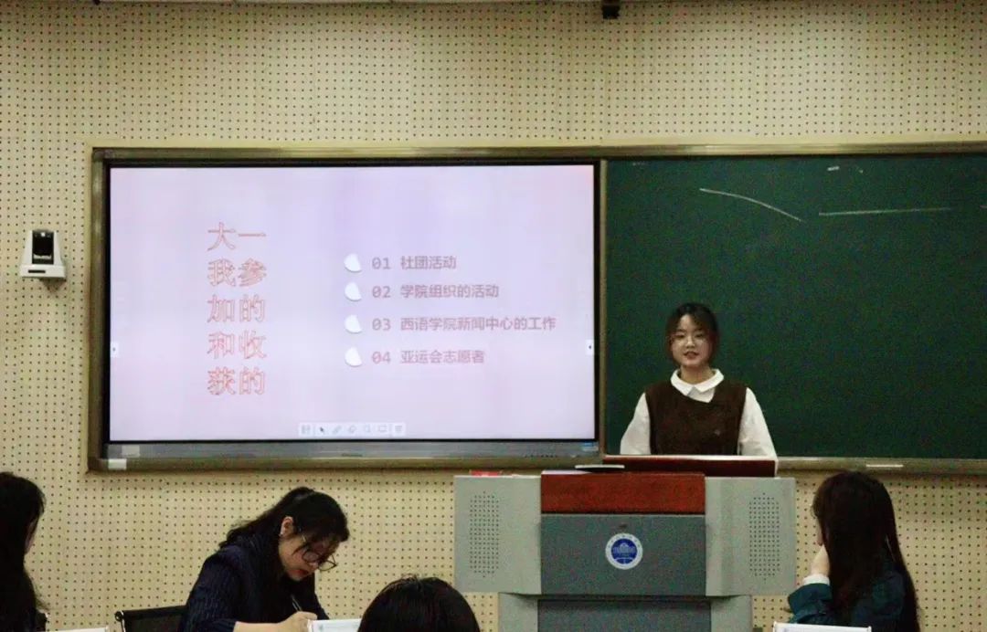 18西语中外合作2班的2022届准校友袁嘉莹学姐娓娓道来,现场分享了她四年来丰富多彩的课外活动经历。刚刚结束在新华社浙江分社实习的她在大学期间积极参加志愿服务,其中包含了世界互联网大会、中国义乌进口商品博览会、中国质量大会、华侨进口商品博览会杭州国际日、首届浙江省国际友城媒体合作传播论坛等大型活动。她在分享中指出,大学期间不但要以学习为重,也要积极参加各项活动,她参加的这些活动让她开阔了眼界、增强了自信、提升了能力、拓宽了人际关系,也帮助她培养了兴趣、找到了自己热爱的事物。