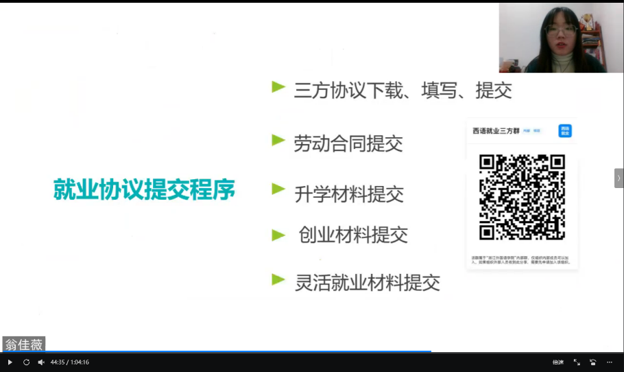学院教务秘书久米色珍和团委书记、辅导员翁佳薇分别就实习、就业工作的具体安排做了讲解。