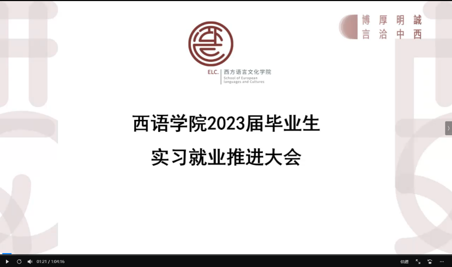 3月1日,西语学院于线上召开了2023届毕业生实习就业推进大会,学院副院长王忆停、党总支副书记方盼、教务秘书和团委书记、辅导员,以及全体2023届毕业生参加了大会。